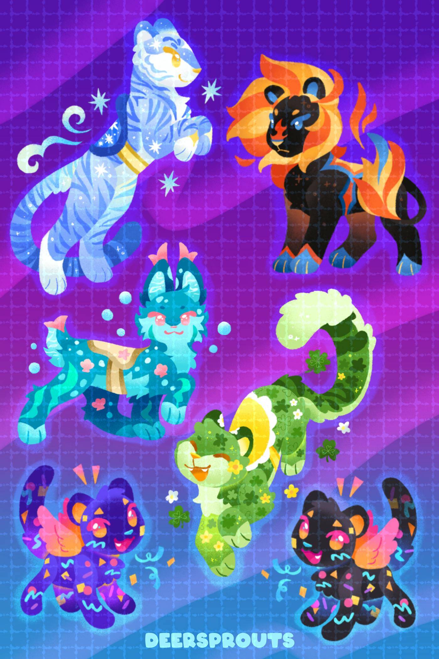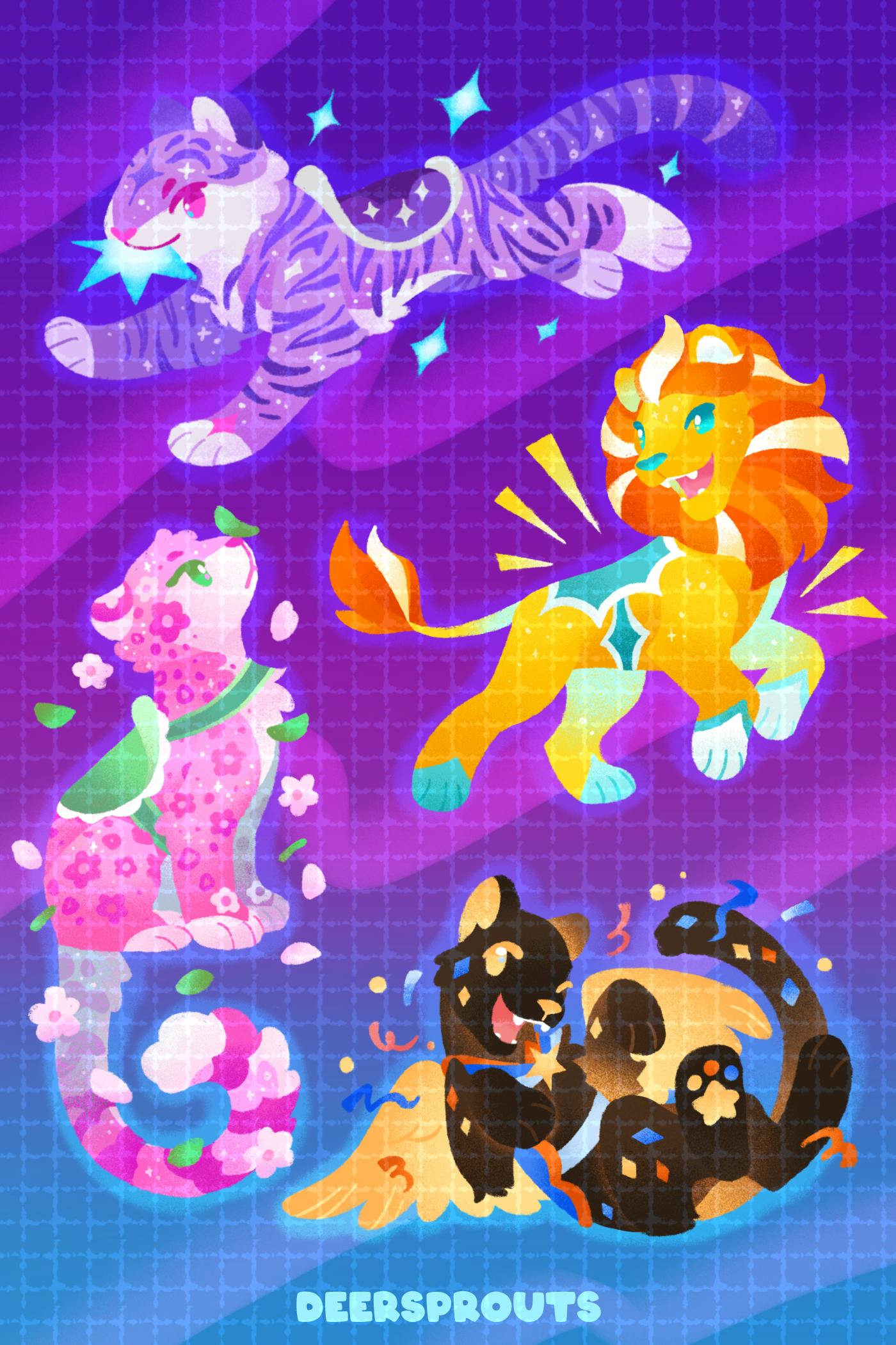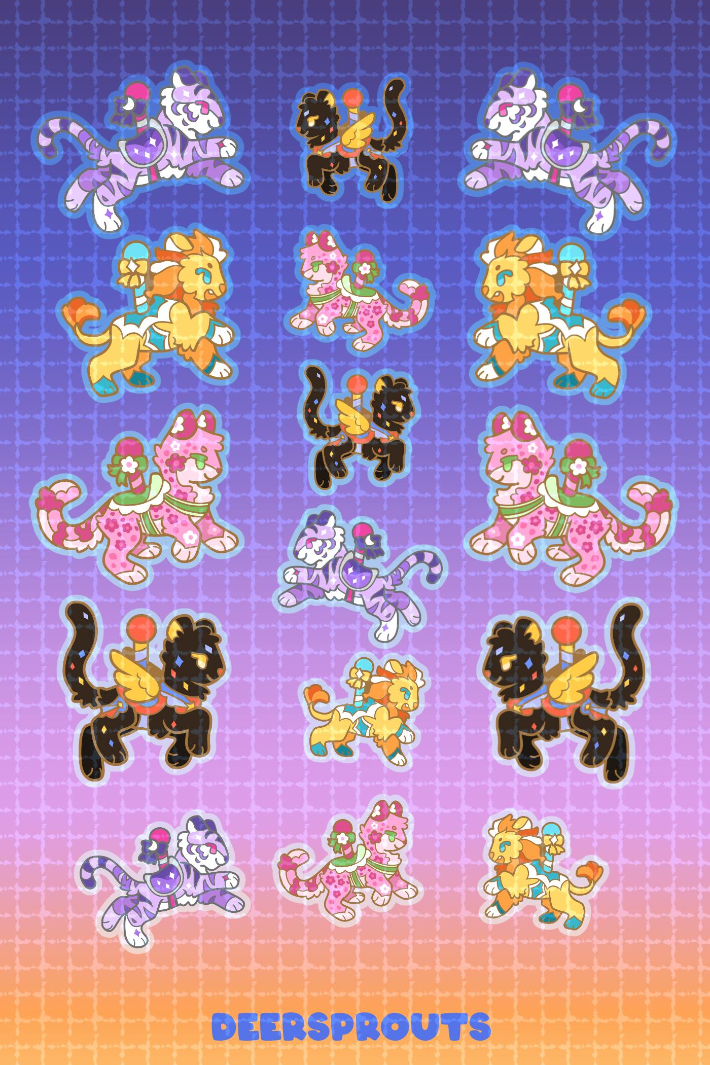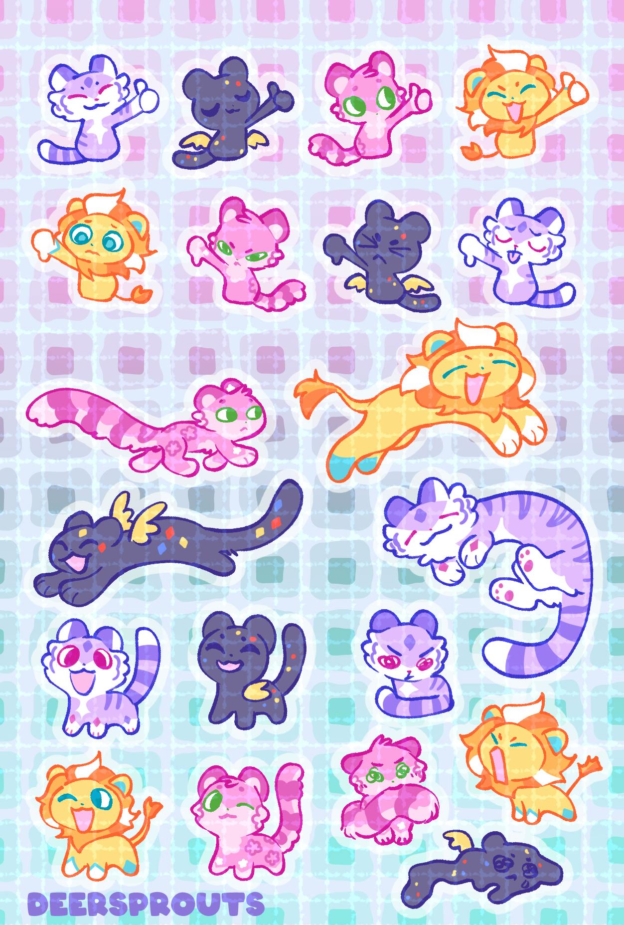 I have finalized the sticker sheets that I'll have available! I really wanted to add more, but I decided that this was a good amount and I really needed to keep moving forward. As a reminder, the stickers themselves will be clear vinyl, so the backgrounds and colored borders will not be present on the final stickers. There will be a transparent border around them.