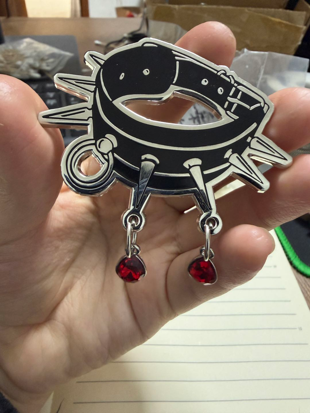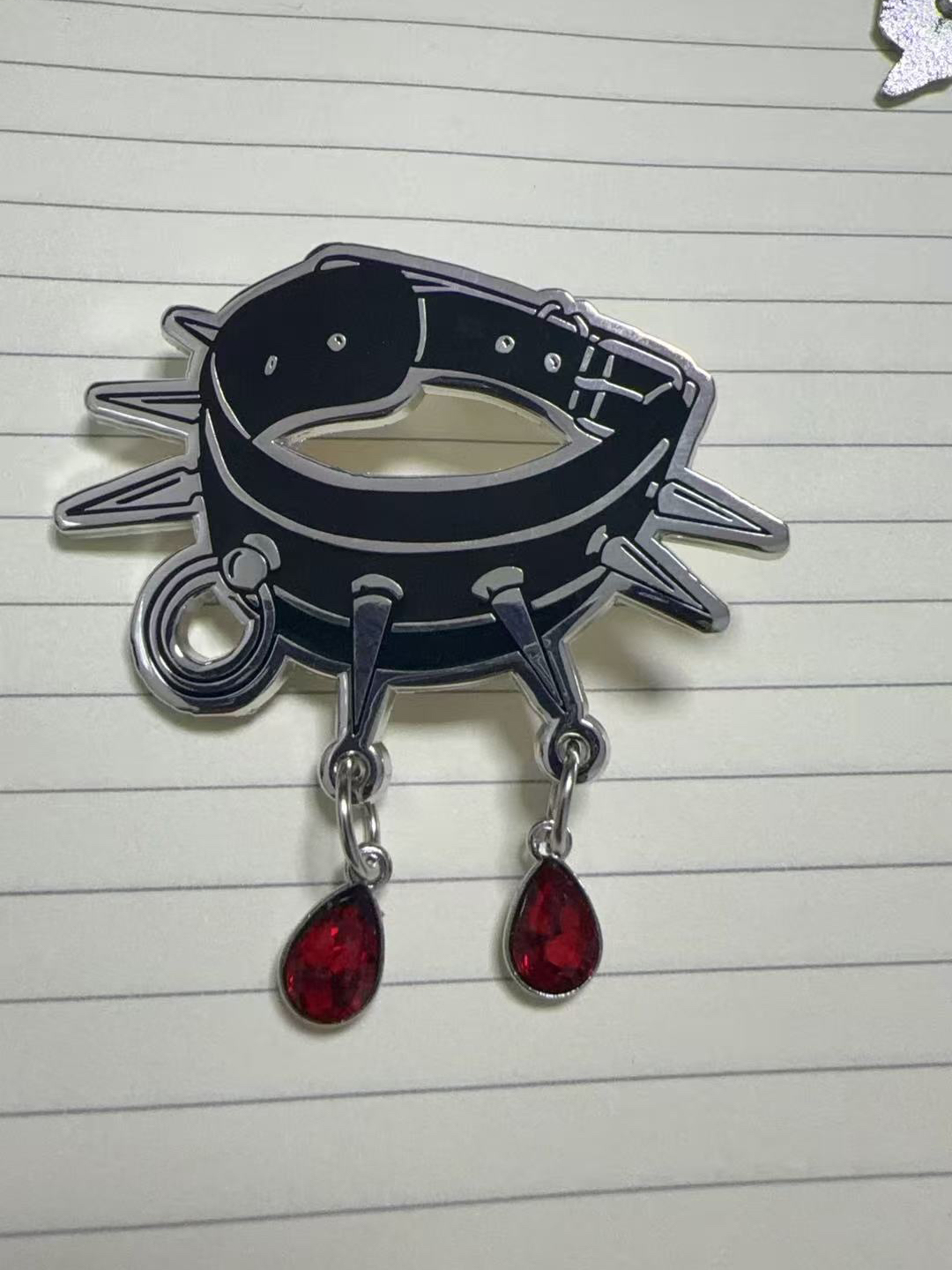 The screenprinting for the "Bloody Collar" pin is in process, as is the glitter/stained glass for the "Glass of Blood" pin (not shown). Apparently the factory is behind. I was most concerned about the gems for the "Bloody Collar" pin, and glad to see the manufacturer understood what I wanted.