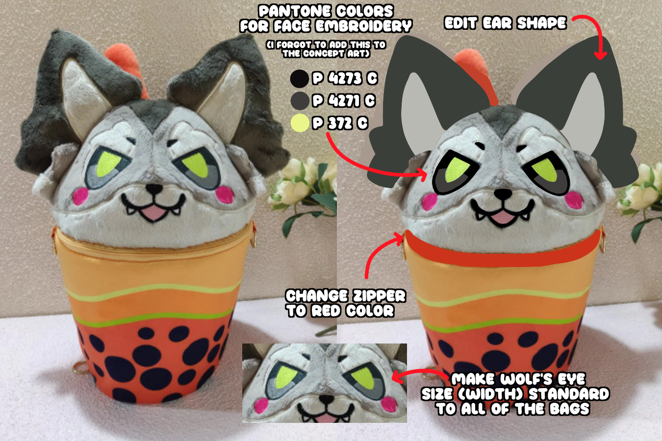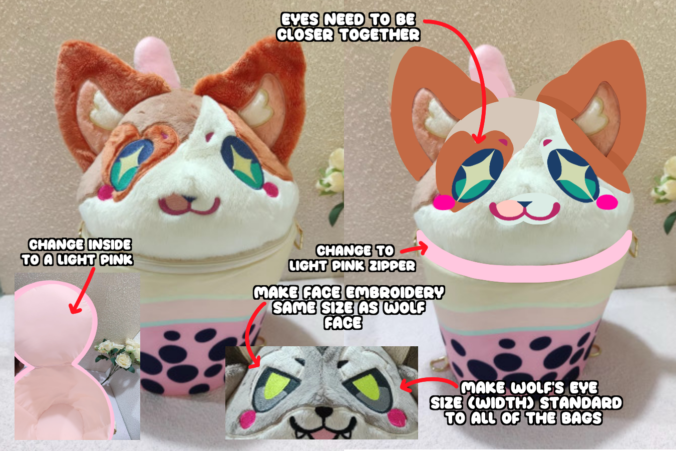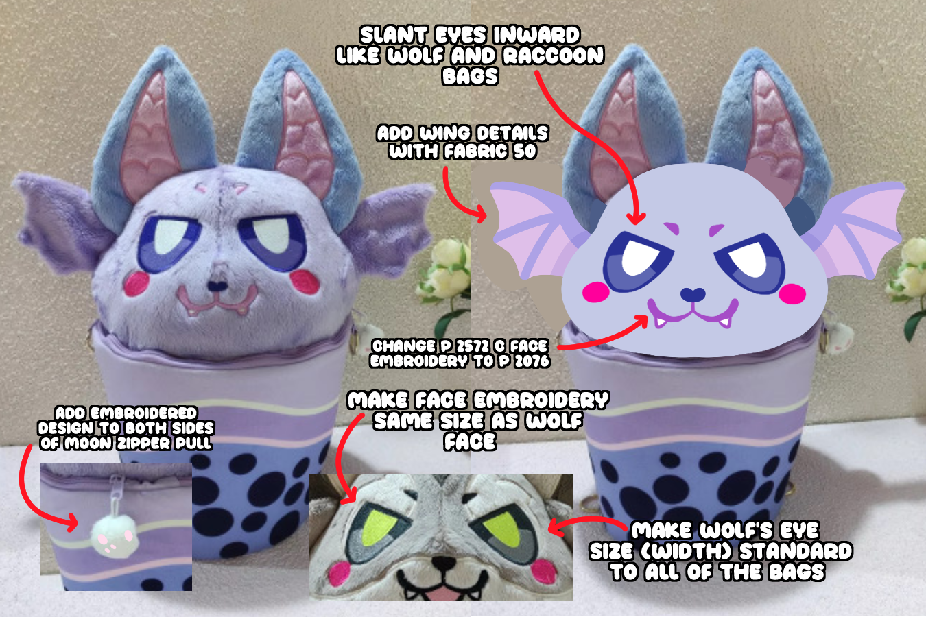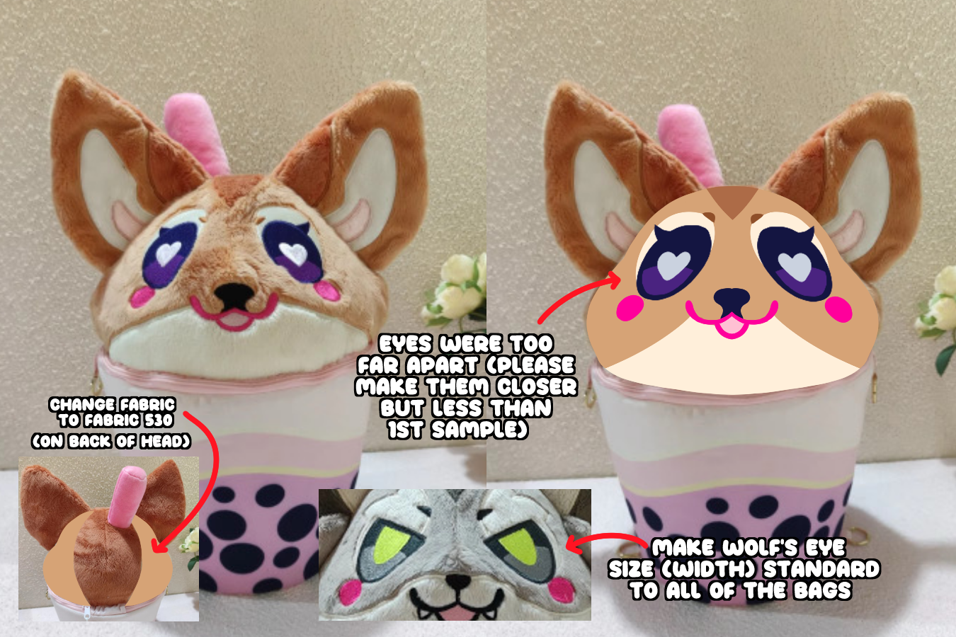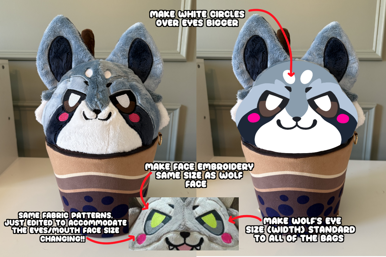 I also ordered a new Fawn sample because I wanted to make a couple tweaks to it!! And I'm planning on ordering a new Raccoon sample. I really love how the Wolf's face came out, the eyes are big n' cute, so I'd really love all of the bags to reflect this!!