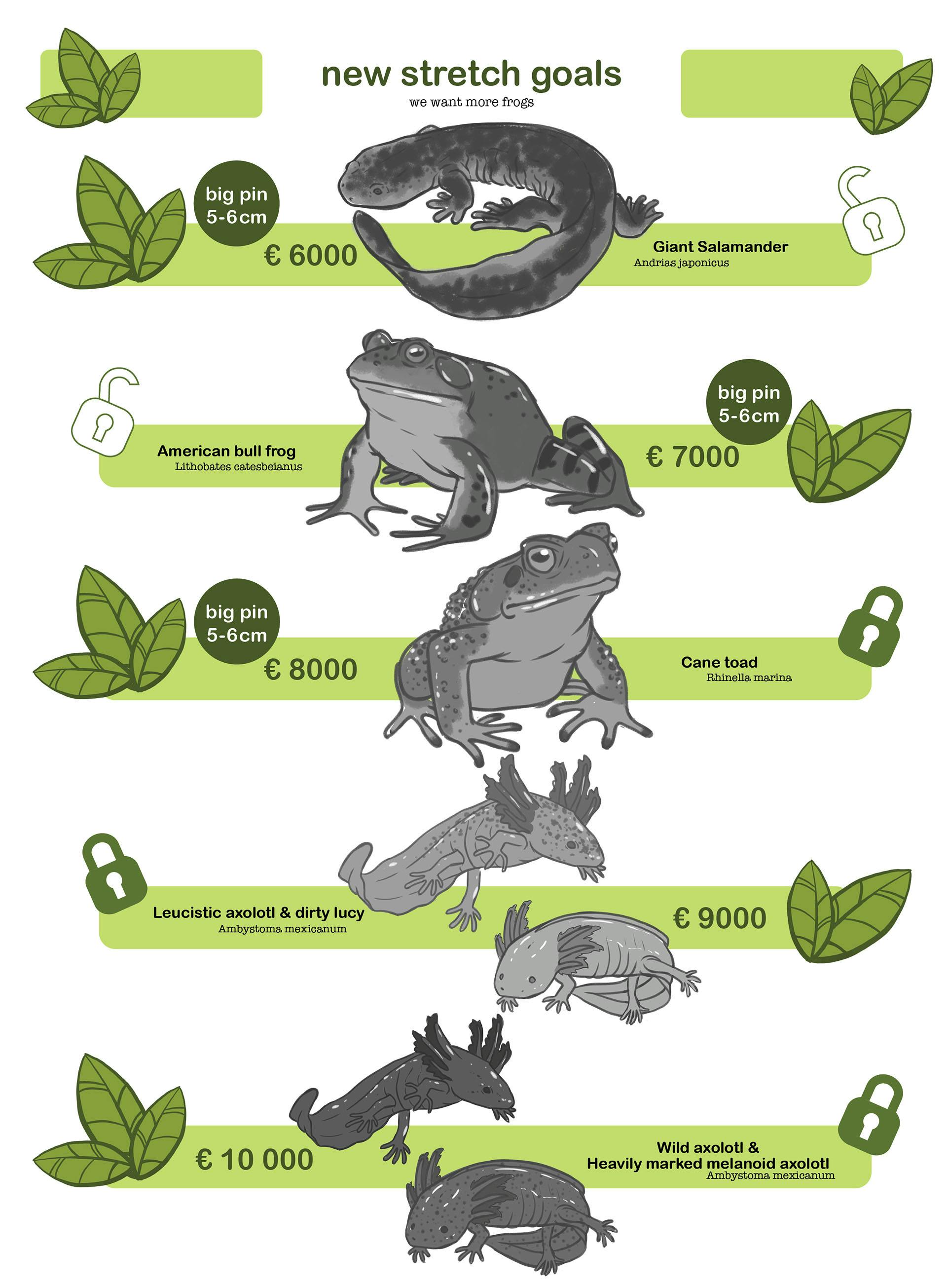 β’ All designs are unlocked, except the stretch goals above. Totaling in 17 amphibians to choose from as of right now. (The big pins will cost the same as the other enamel pins: β¬12 no extra costs.)