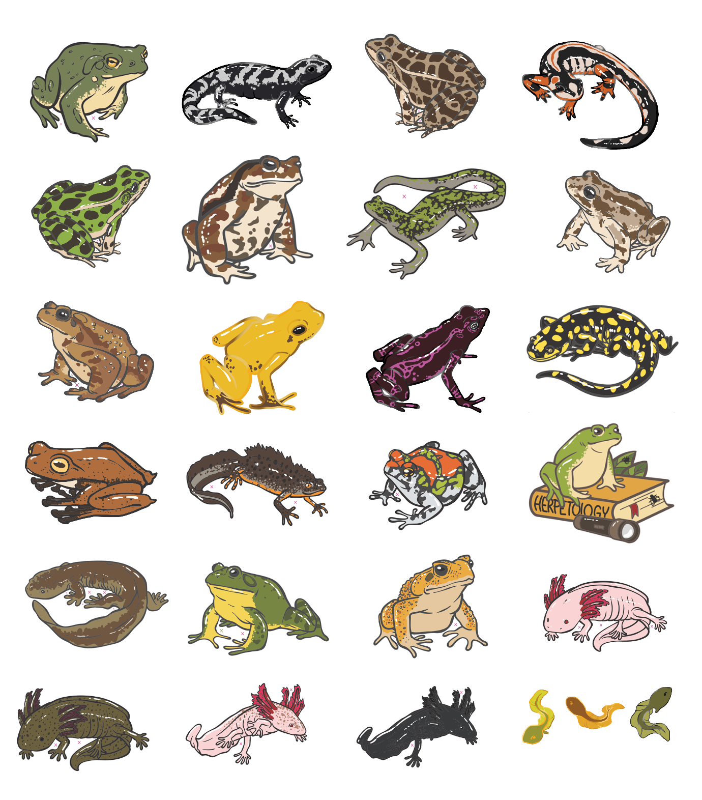 The other products update The acrylic keychains have been ordered a few weeks back, those will have the first colour run but I think this is pretty fun to have the differences between the amphibians. So many have different tones of coloures between the same type of frog already, it's like a mimic of real life. After this print run is sold out I will update the artworks to fit the colours of the enamel pins.
