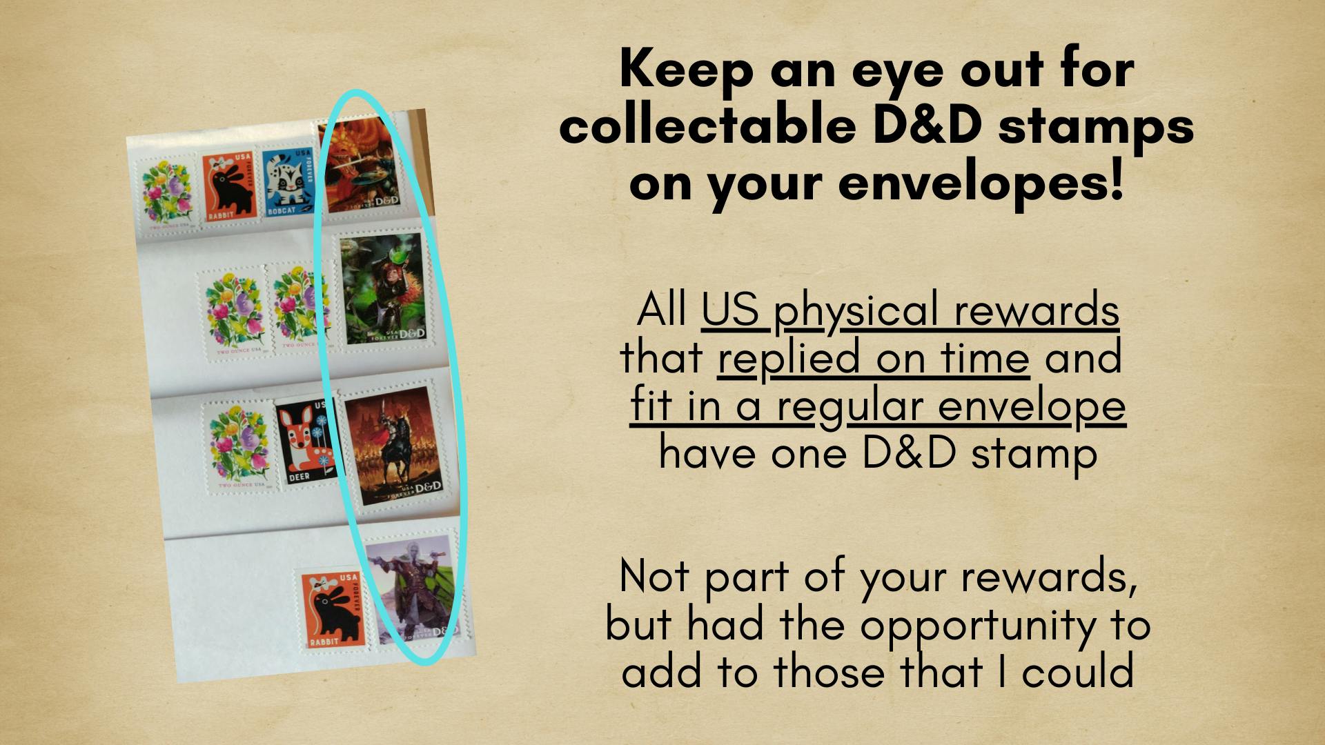 For US orders that I could use forever stamps on, I was able to get enough limited edition D&D stamps to put one stamp on each envelope! If you want an extra little collectable, make sure to check your envelope before throwing it away. I wasn't able to do these for large packages or international orders, but for the orders that I could, I'm hoping it's a nice bonus.