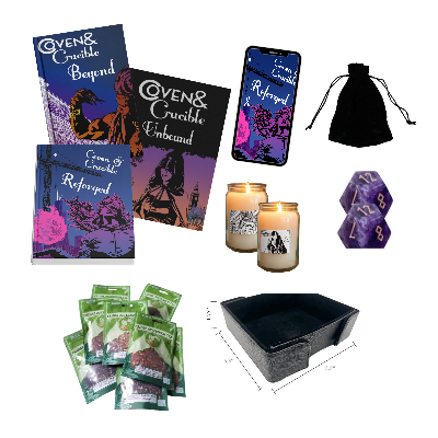 You'll get a copy of Coven & Crucible: Reforged in both hard cover and pdf. The hard cover will be 200 full color pages measuring 8 1/2" x 11". You'll also receive two different loose leaf teas (from Friday Afternoon Teas) and two different candles (from Cantrip Candles). The teas and candles are inspired by the Coven and Crucibles of the game. You'll also receive 2 d12 carved from amethyst (from Norse Foundry), a dice bag to hold them in, and a dice tray.