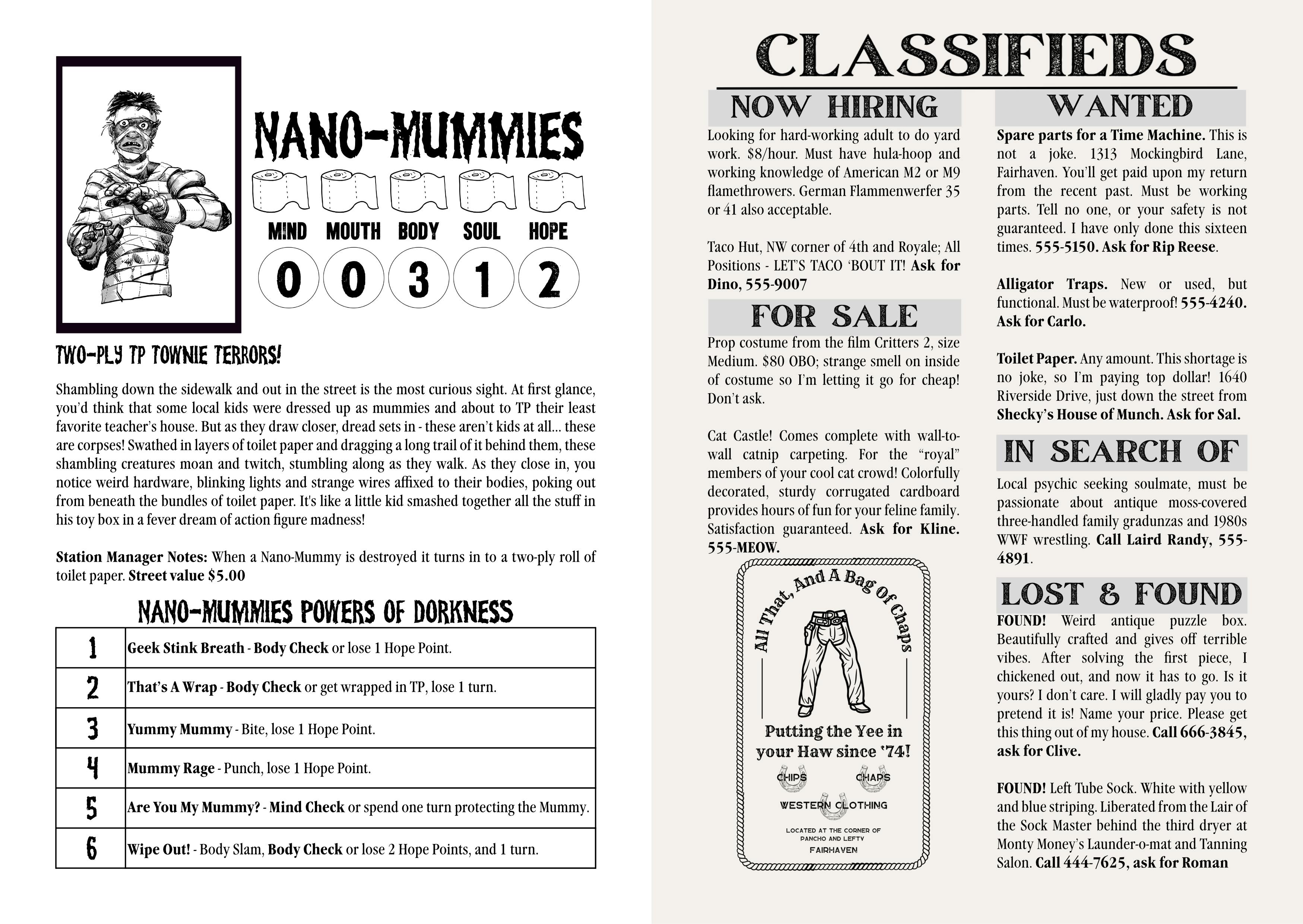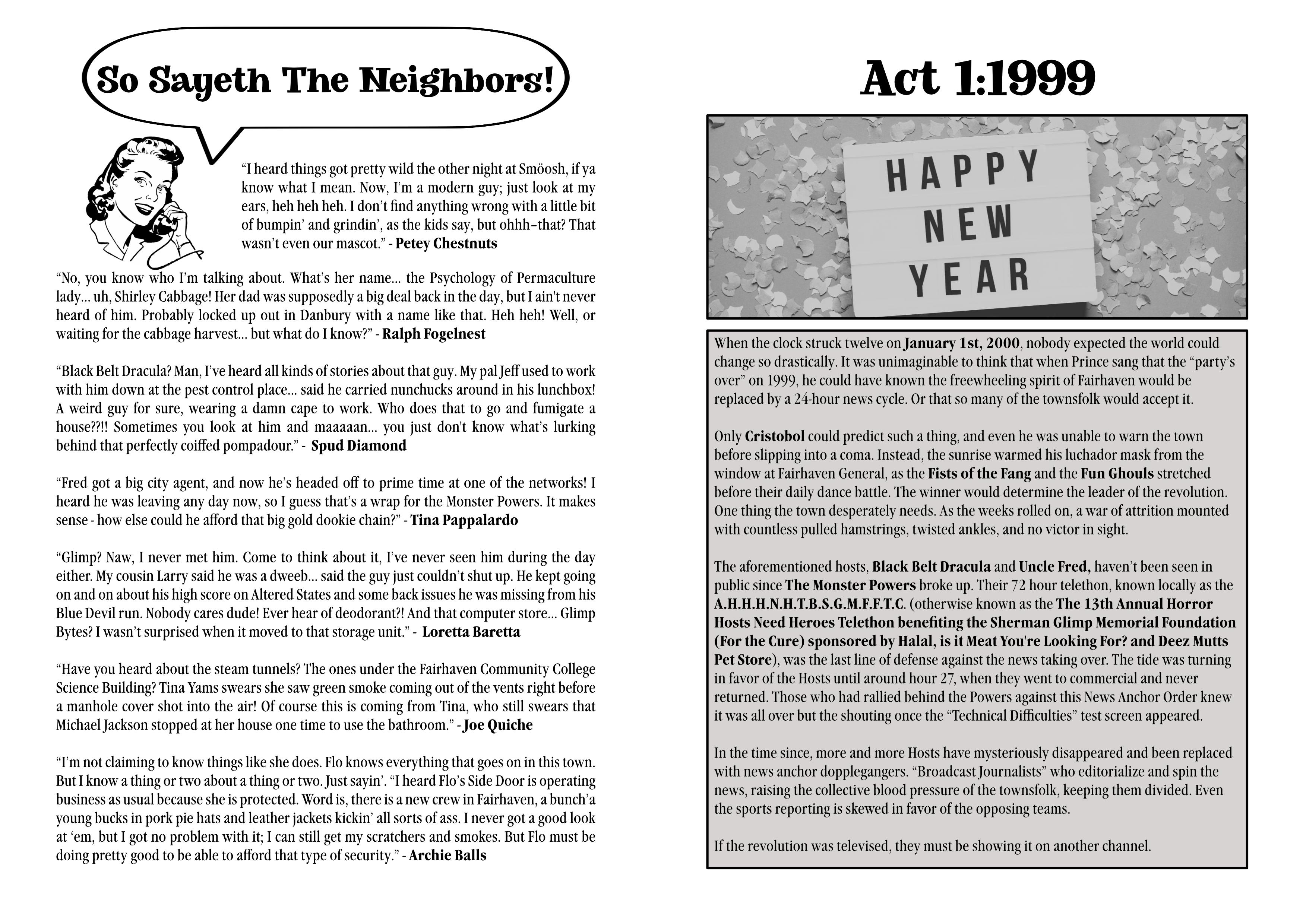 On January 1st, 2000, 6:00 am, EST, Mindkryme 666, a sinister sentient AI, went online and took over WHPA's programming, replacing it with a 24-hour news cycle that is driving the townsfolk mad.
