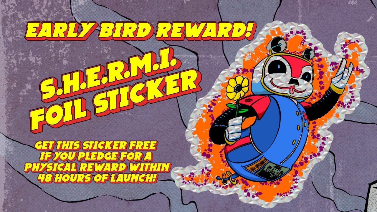 Score this totally sweet foil sticker of S.H.E.R.M.I. (Sentient Host Enforcement Remote Machine Intelligence) when you pledge for a physical reward within 48 hours of launch! Don't Miss Out!