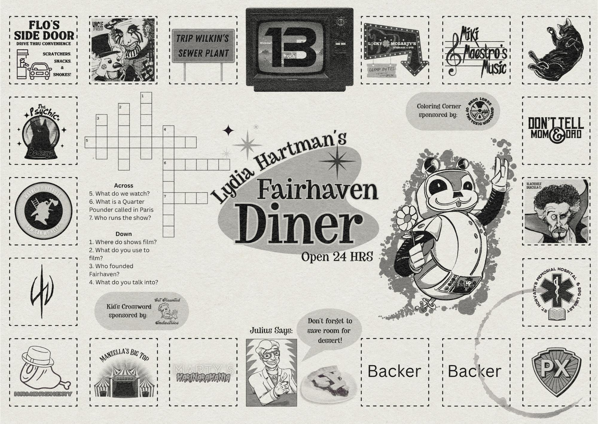I got so pumped designing it that I thought, why not make it a real thing? So, as a new incentive, if we reach 200 backers, all physical tiers will include a Fairhaven Diner Placemat poster.