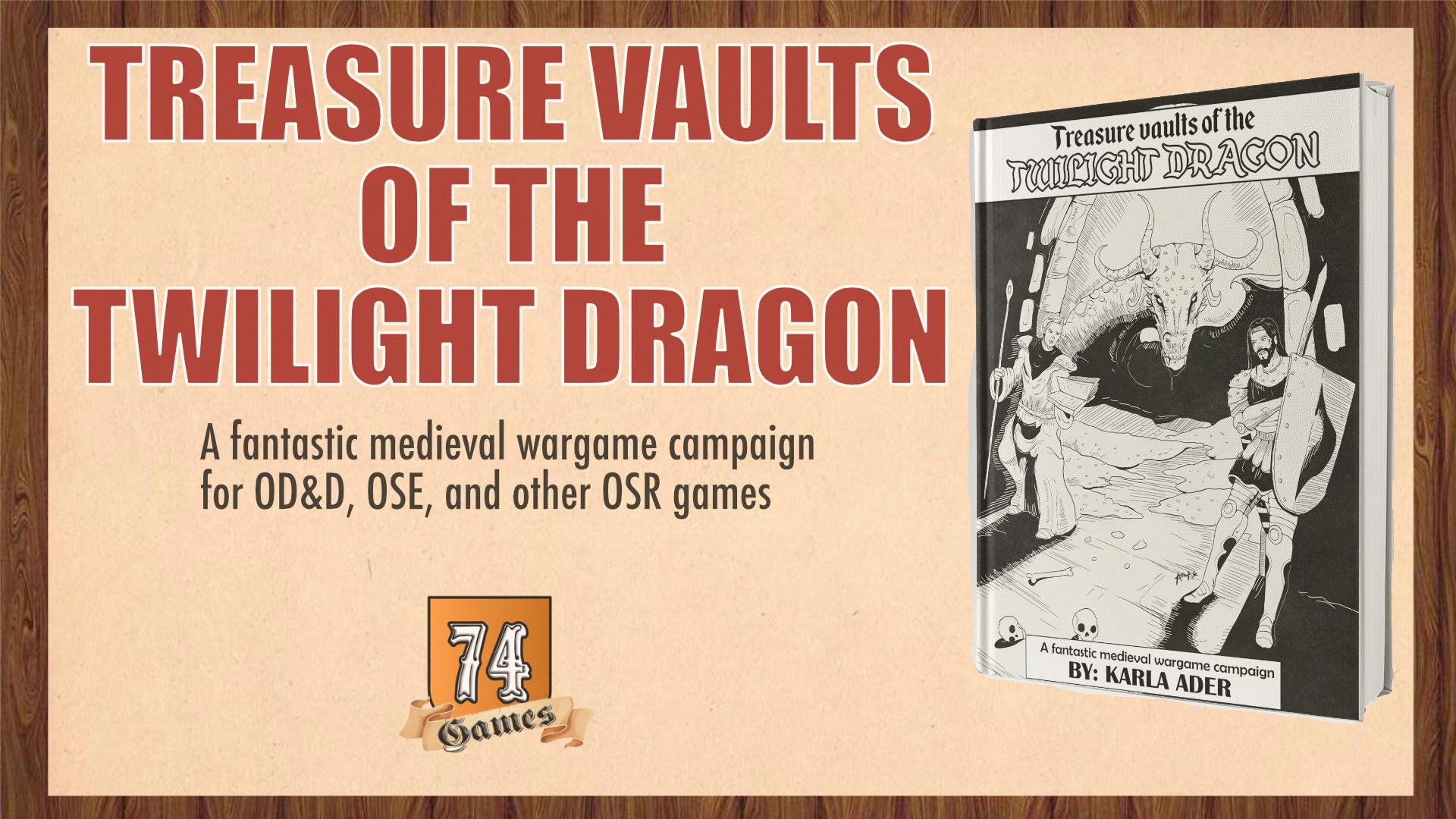 Treasure Vaults of the Twilight Dragon is a classic dungeon-crawling adventure for Original D&D, or retro clones such as Swords & Wizardry, Old School Essentials, or OSRIC. It is a fantastic medieval wargame campaign, pitting players against the armies of the vicious Twilight Dragon as they seek to free the north of his malign influence.