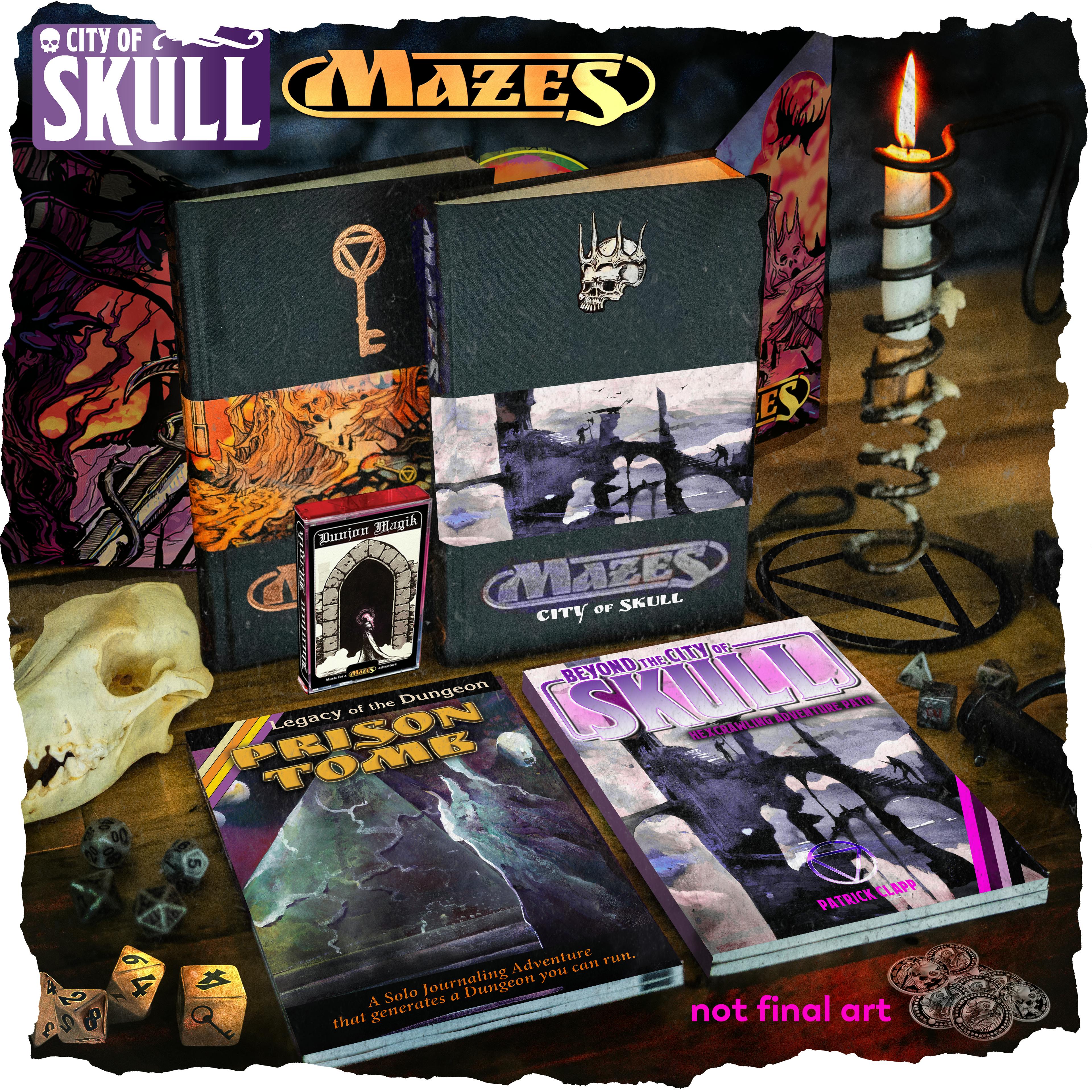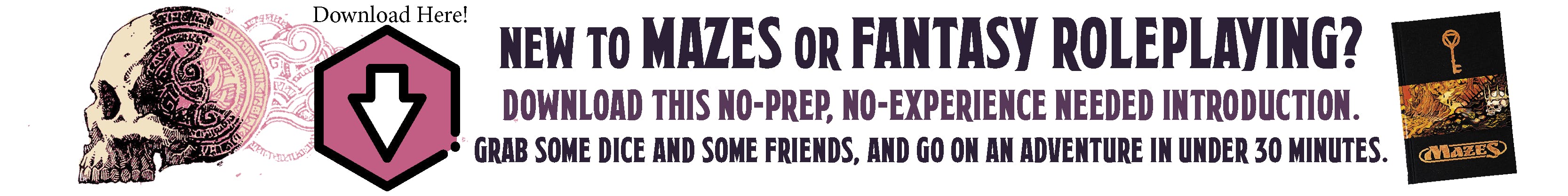 MAZES Fantasy Roleplaying is an old school dungeon crawler with 15 minute setup and one shot play in just 2 hours. This campaign expands MAZES with the City of Skull campaign setting, adventure, and additional accessories.