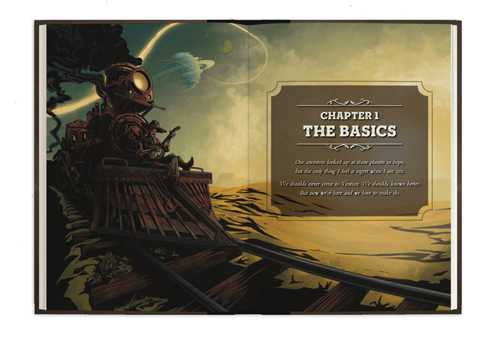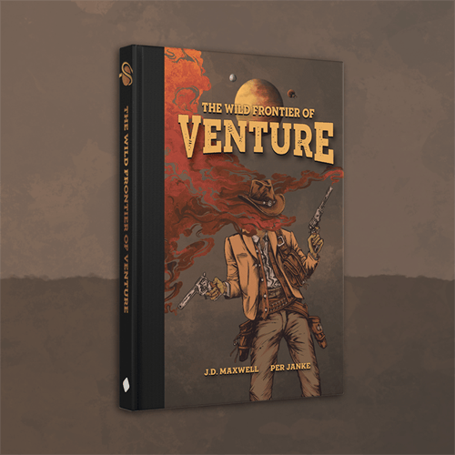 The Wild Frontier of Venture: A 200-page hardcover RPG book with a clean layout, over 100 evocative illustrations, and a focus on easy reference and cinematic storytelling.