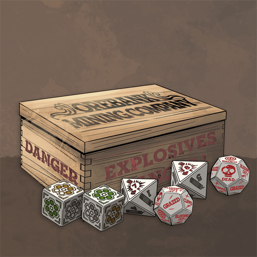 This set of engraved, hand-painted dice is designed for instant readability, with colors that map directly to roll results in the system. The color-coding makes each roll an event, pulling you further into the action with every throw. Comes with 8d6, 4d8, and 3d12. The d6s and d8s are used for base Moxie mechanics, while the d12 is called the Gunshot Die and used to see how wounded people are.