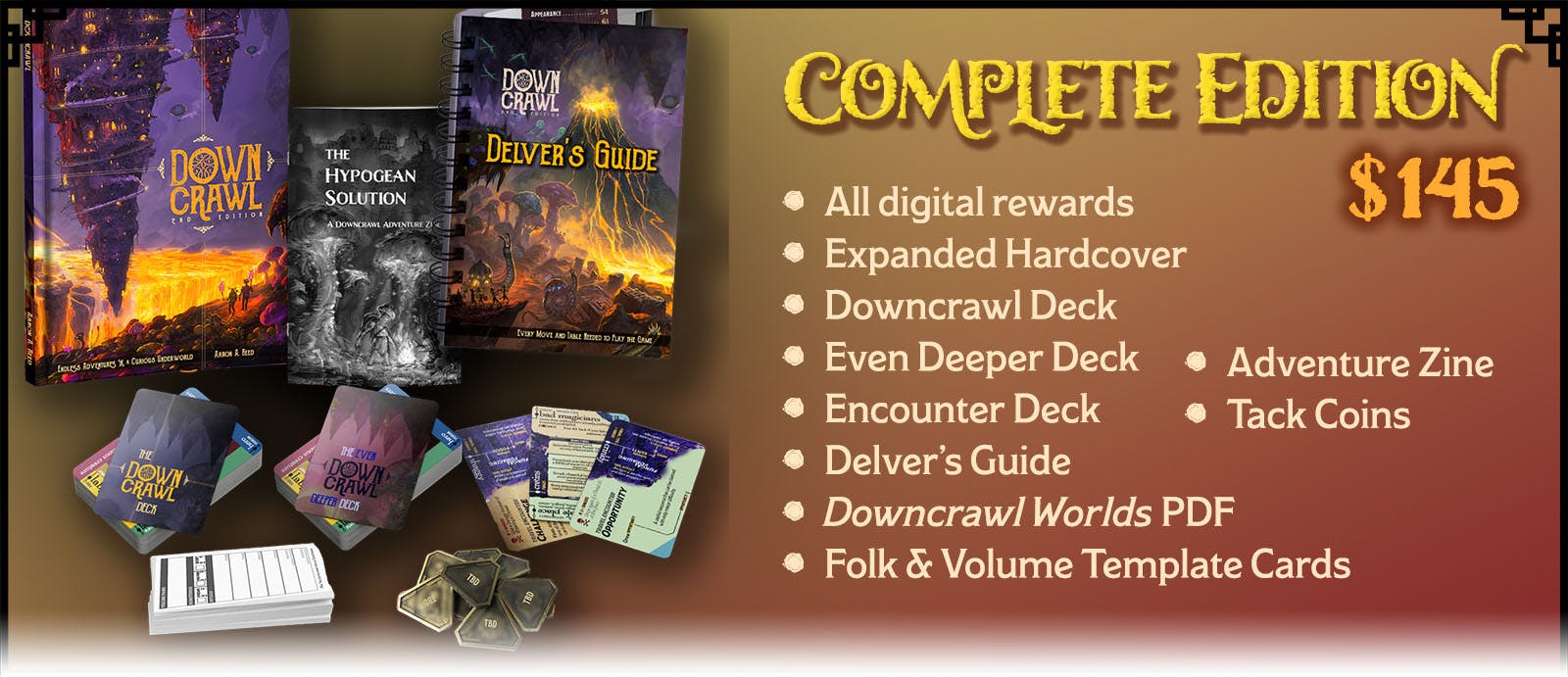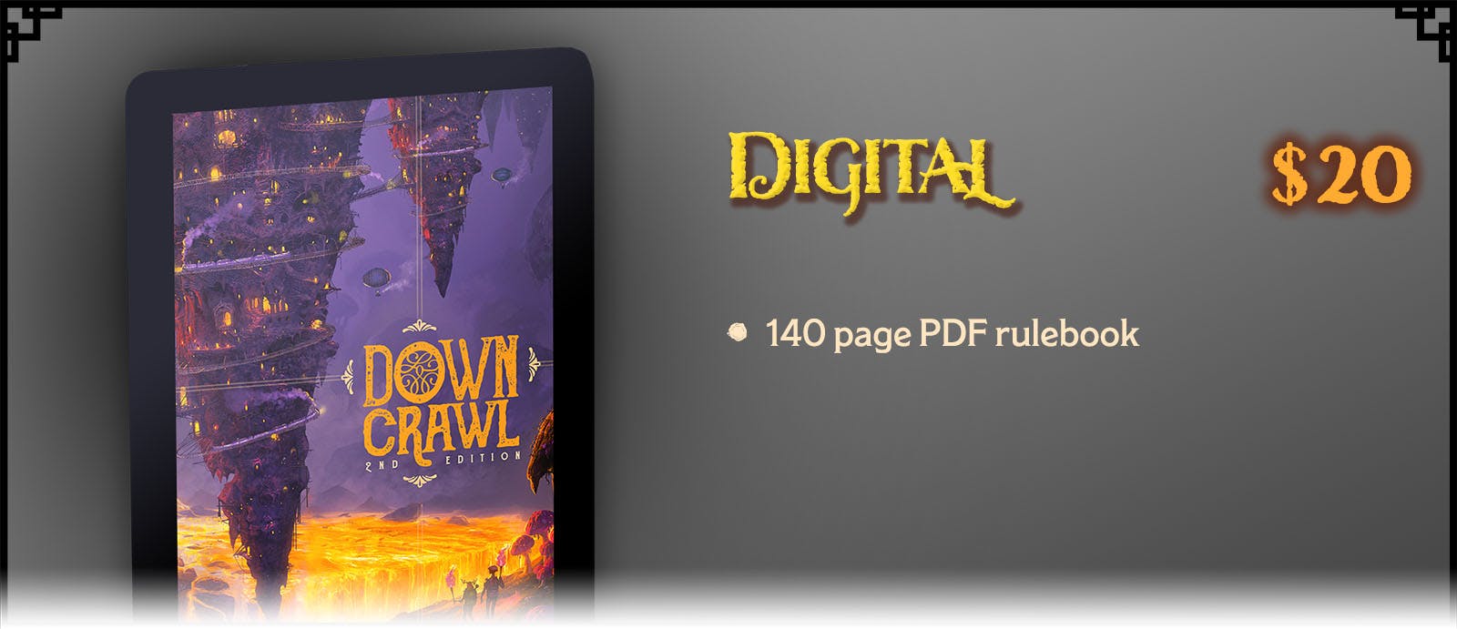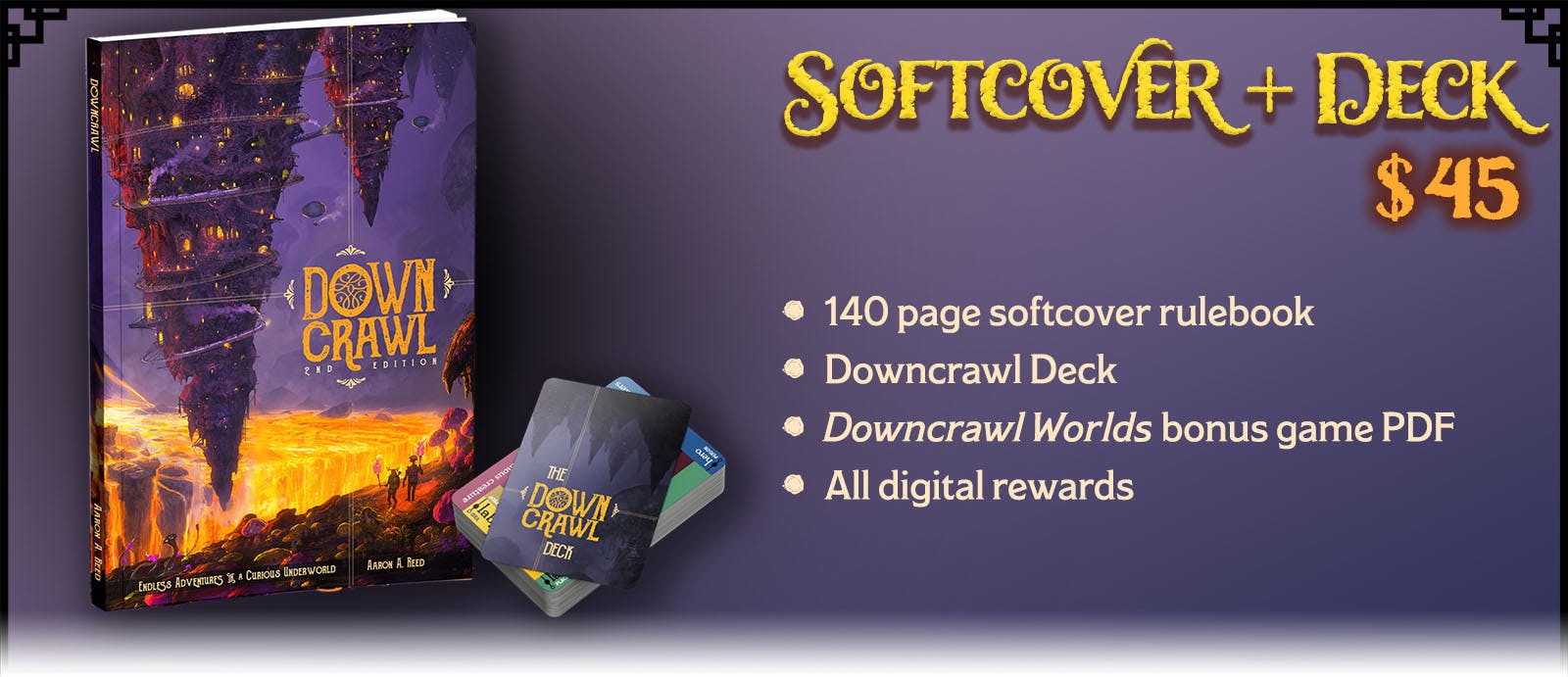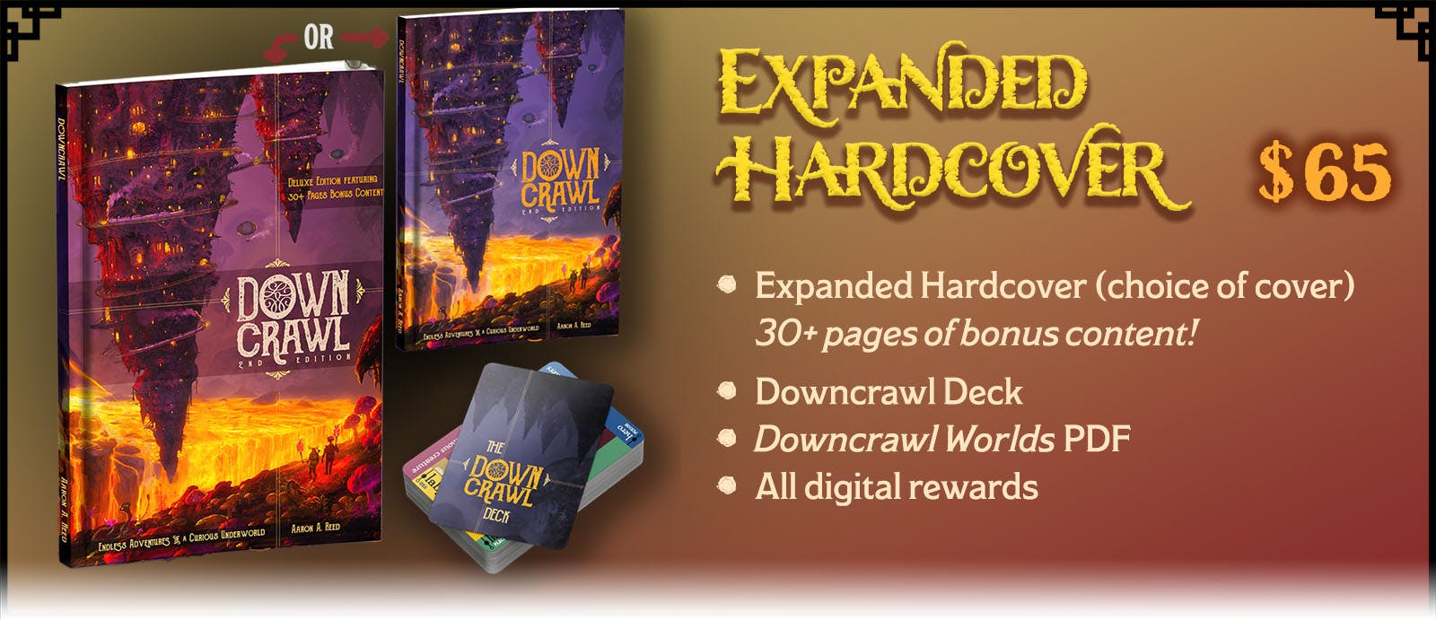 You'll also get a choice of two different cover designs for your hardcover rulebook, the Downcrawl Deck, and all digital rewards.