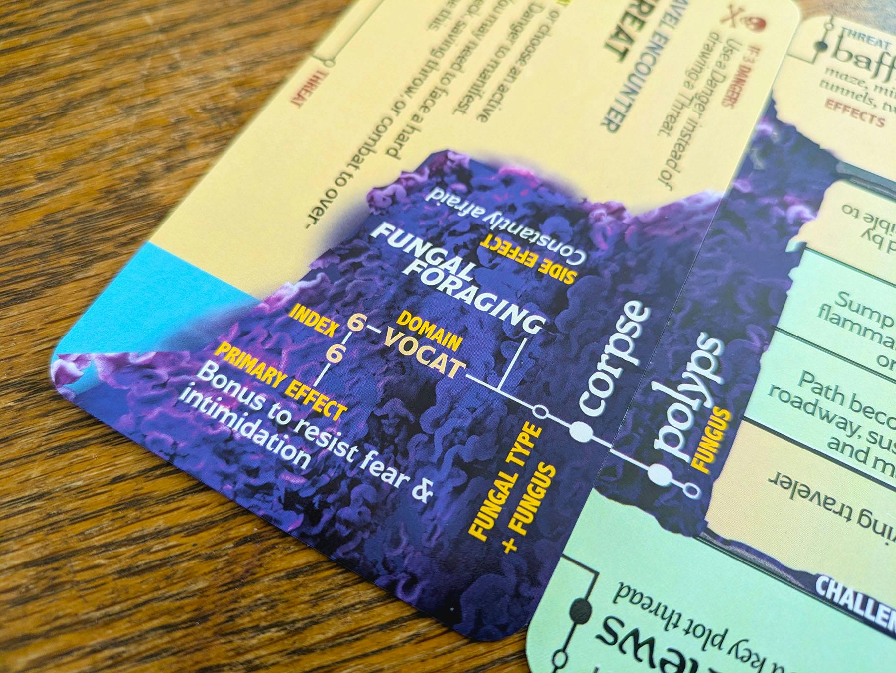 The optional Encounter Deck handles the only two major tables not included in the main deck (for space reasons): Travel Encounters and Fungal Foraging. Both are given room to shine in this glorious add-on deck that helps you assemble complex encounters in seconds.
