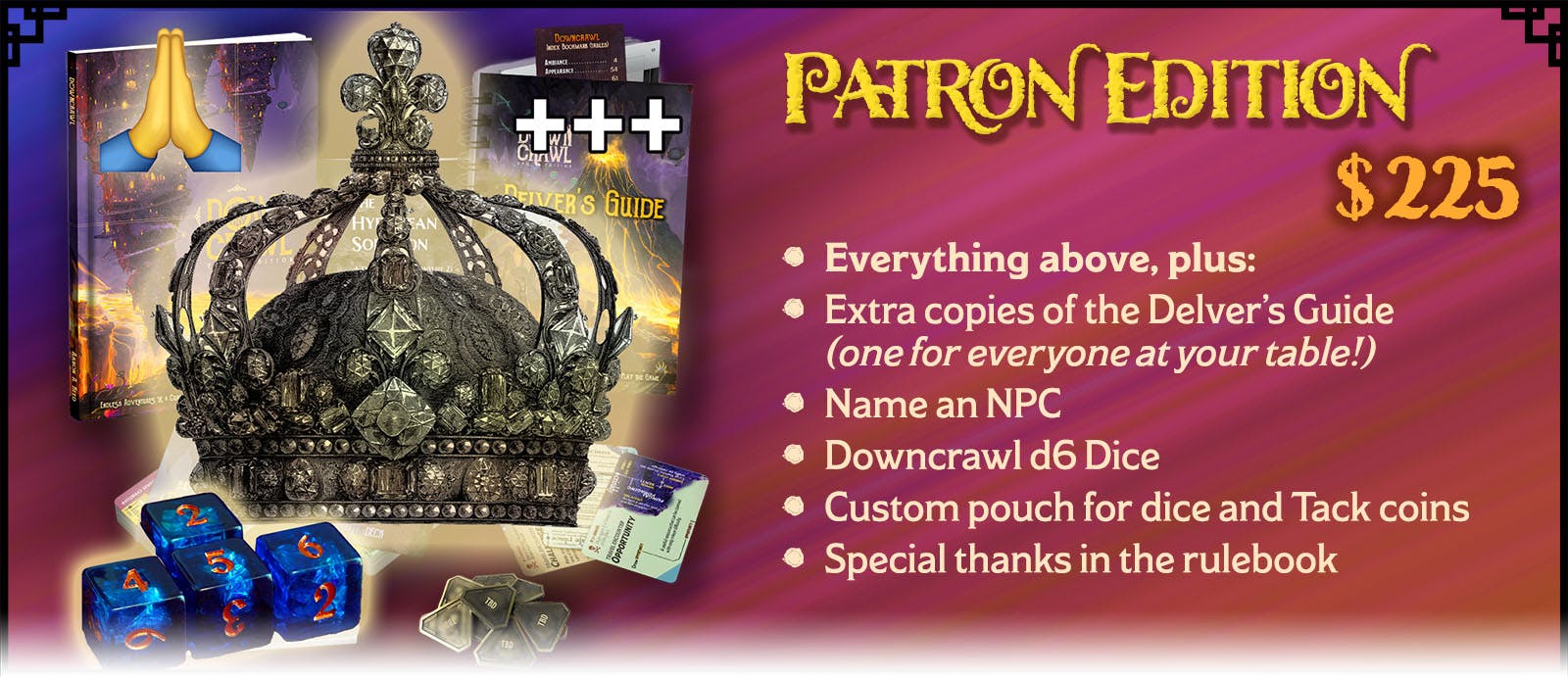 You are a resplendent patron of the roleplaying arts. Everything above PLUS as many extra copies of the Delver's Guide as you need for everyone at your table to have their own (a royal gift!), a set of four beautiful d6 dice, all you need to play*; a nice pouch to hold your dice and Tack coins, special thanks in the rulebook, PLUS you'll get to name an NPC in the core book or Adventure Zine after yourself or a friend. Jeweled crown not included.
