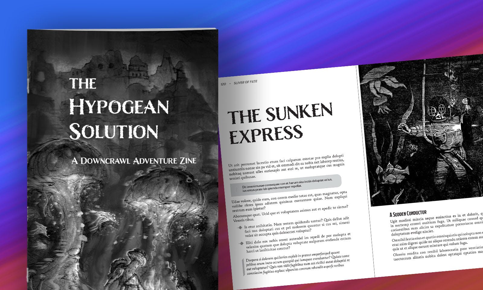A great basis for a three-shot-or-so Downcrawl campaign, or just as an extended example of how larger story arcs function, The Hypogean Solution will have you riding lava-powered railways deep underground, investigating a conspiracy of intelligent slime molds, and delving into many odd and curious corners of the Deep, Deep Down...