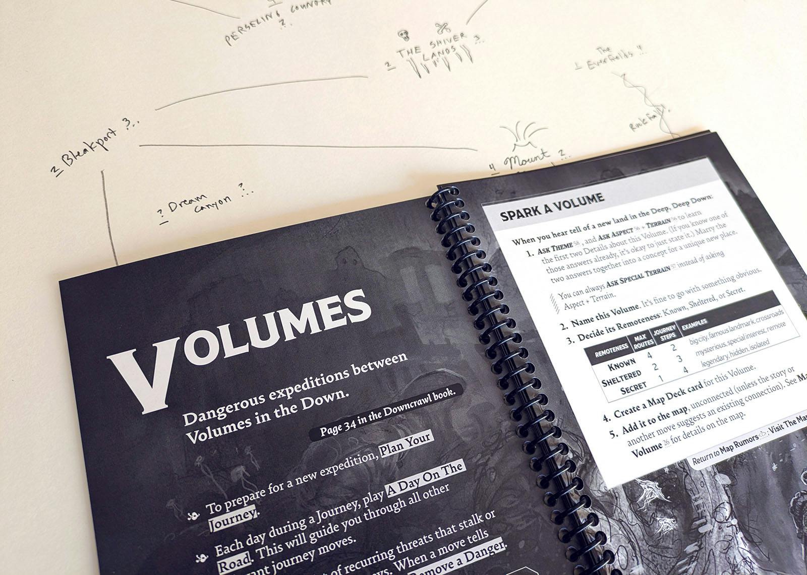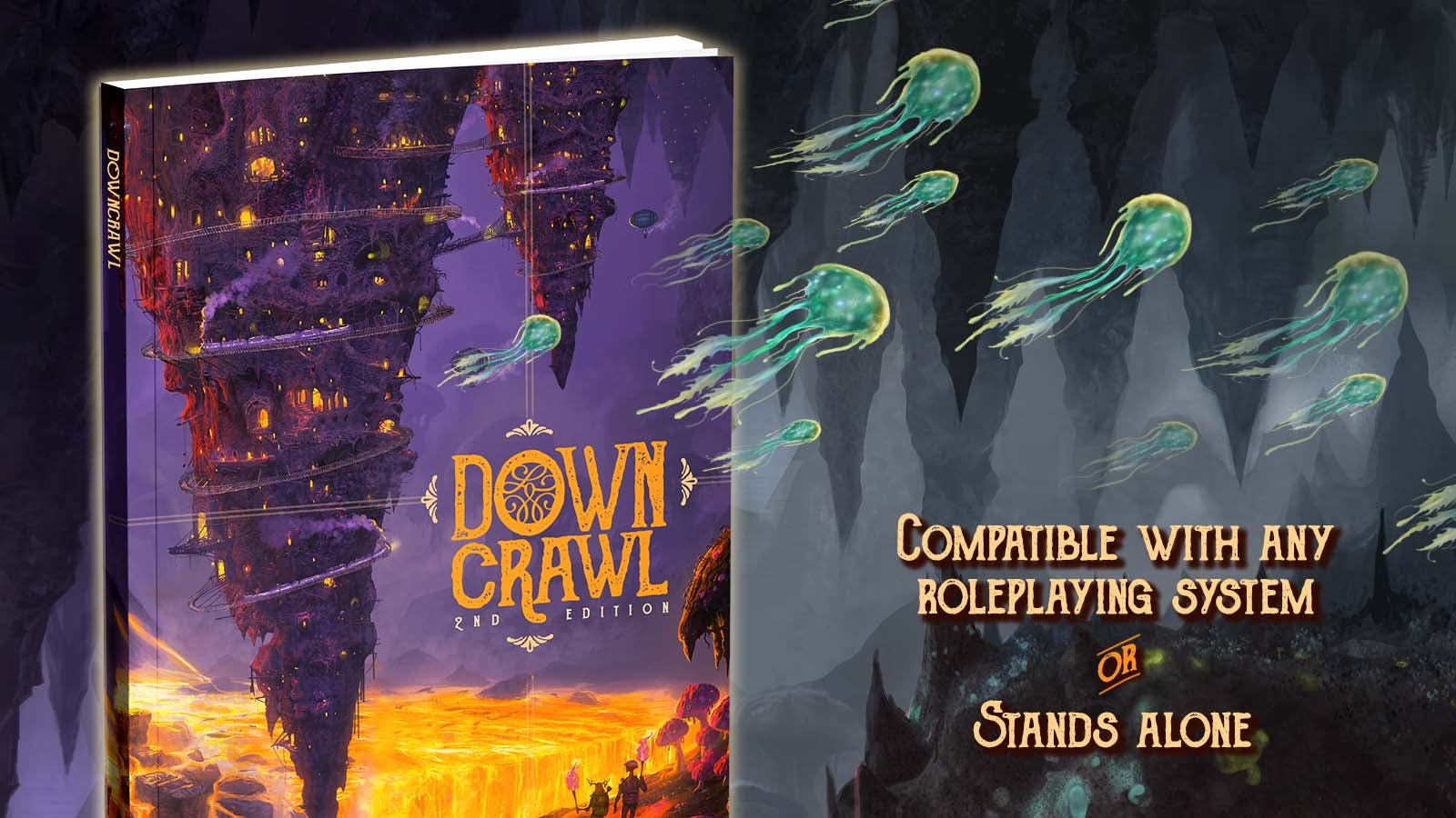 Downcrawl is a tabletop roleplaying game and toolkit that helps you build and explore a weird, wondrous underworld, so far from the surface that the sun and sky are only legend. Evocative prompts help you improvise stories of dangerous journeys, curious creatures, and strange underground empires. Just-in-time generation rules give you just what you need to continue your story, allowing your world to keep growing step by step as you explore it.