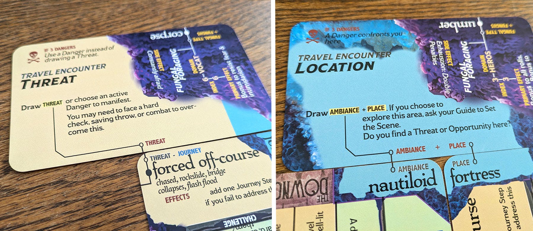 The Encounter Deck cards fit together like jigsaw pieces to assemble a strange encounter on the road (or with a magical fungus). Your first draw gives you an encounter type (Challenge, Threat, Opportunity, or Location) which then provides instructions for further draws and how to align them to complete the prompt.
