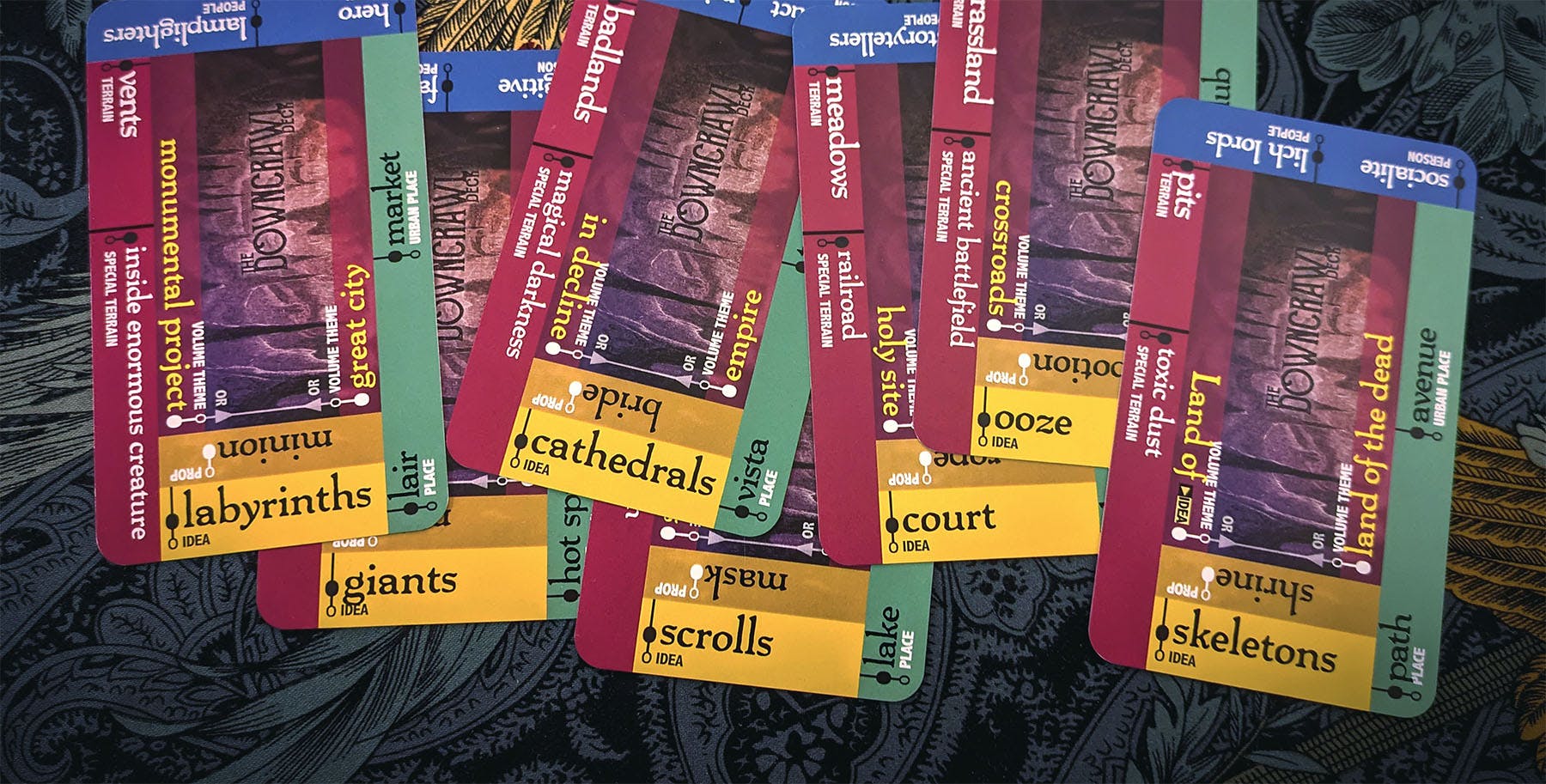 Need inspiration even faster? Use the optional Downcrawl Deck to get a Table result in seconds: simply flip the top card and align the colors for the prompt you need. (More about the Deck further down the page!)
