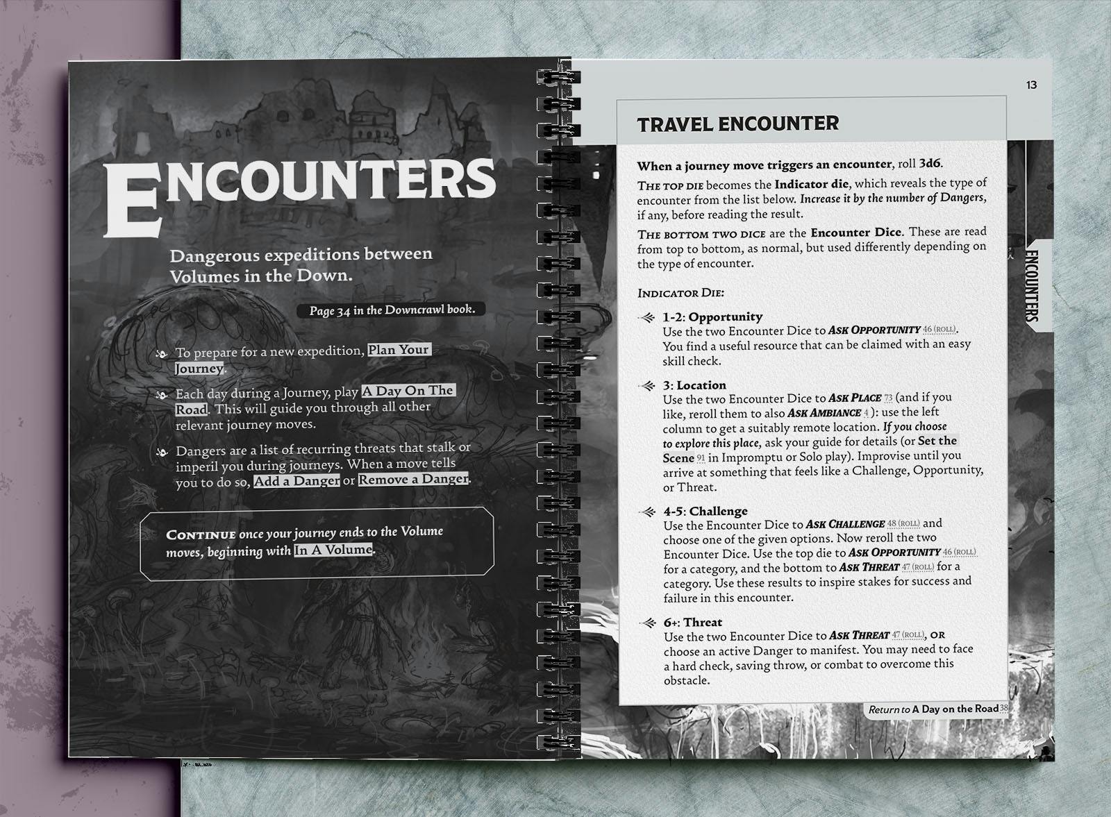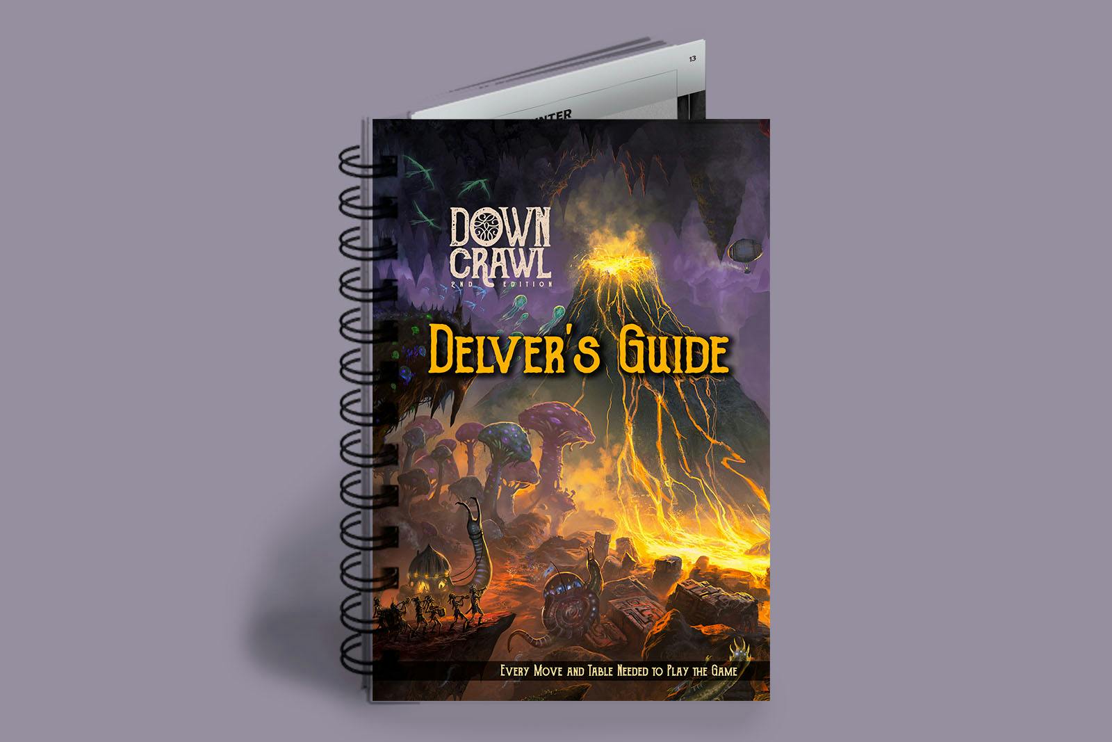 The Delver's Guide is a spiral-bound reference guide that gathers all the Downcrawl Moves and Tables into a 40-page 6"x9" handbook, easy to pass around the table. The layflat binding makes it easy to keep the current Move or Table visible while you play. Works as a quick reference for the GM, to pass between players, or to keep beside you for solo play.