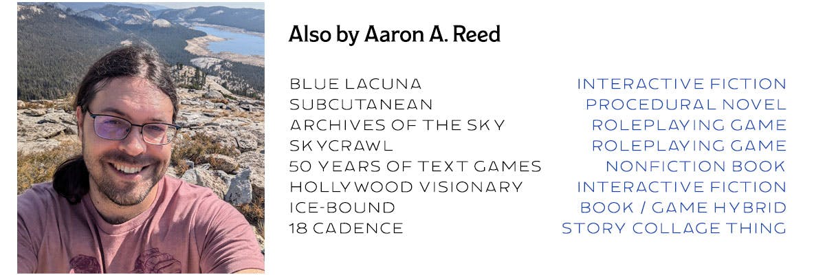 Hi, I'm Aaron! I'm a writer and game designer: you might know me from projects like 50 Years of Text Games, Blue Lacuna, or Archives of the Sky. I've been playing tabletop roleplaying games since I first discovered they existed at theater camp in 6th grade, and making digital games almost as long. I love finding new ways for people to collaborate together through rules and systems.