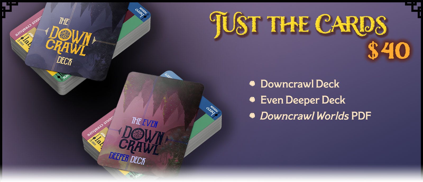 Just want the Downcrawl Deck cards? We've got you covered. This tier does not include the rulebook, but does get you both inspiration decks (great for subterranean-themed idea generation) and the rules for Downcrawl Worlds, the standalone worldbuilding game that uses the cards.
