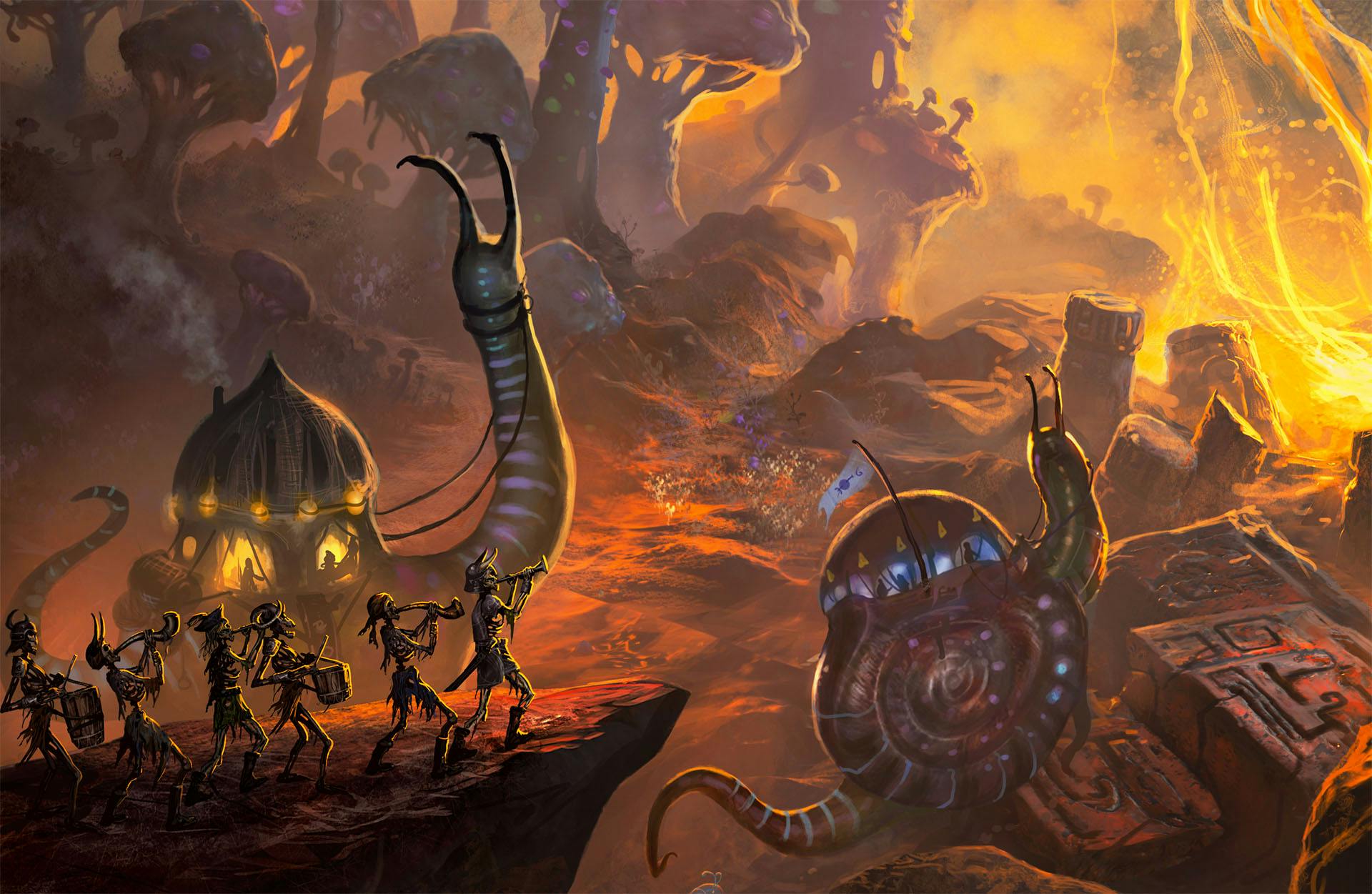 Cheerful skeleton bards sing ballads on fragile lutes. Antlered children race giggling through shell-paved streets. Faceless cultists worship huge red worms, chanting behind obsidian walls. This is the Deep, Deep Down.