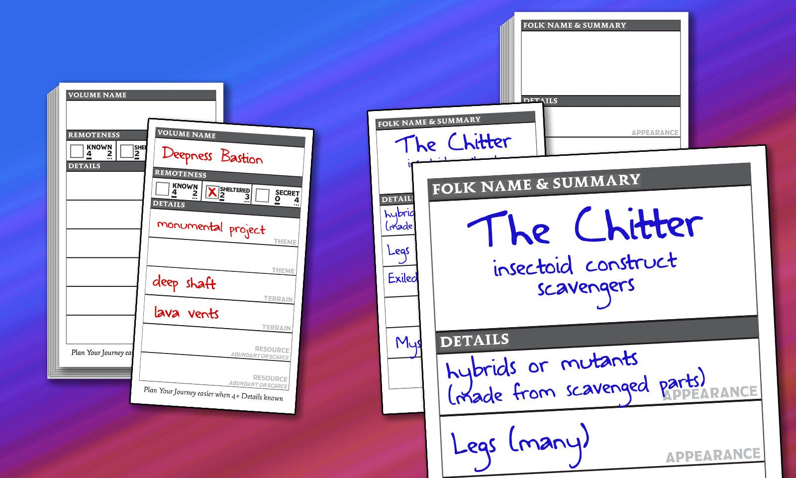 Blank Folk and Volume Template cards help you track the peoples and places you create along the way