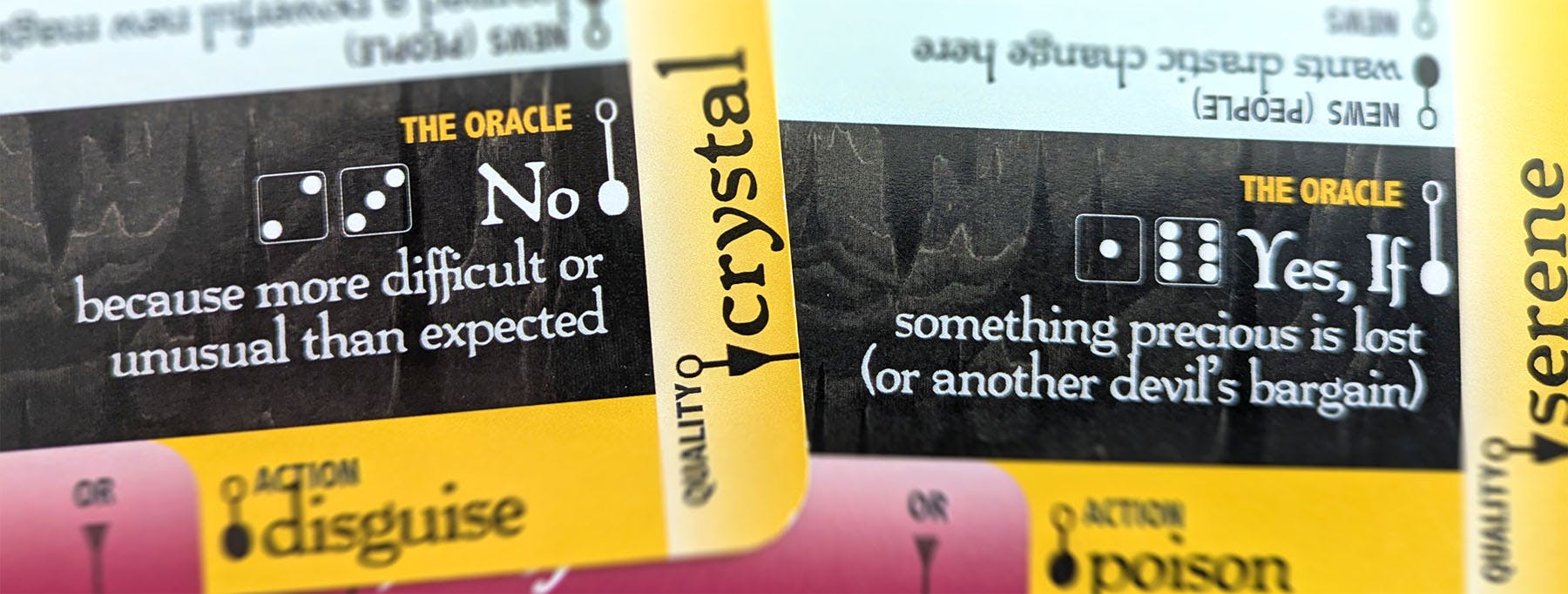 The Deck includes subterranean prompts for everything from story hooks to creature appearance, terrain modifier to reputation, random resources, city locations, area themes, and more. It also features an oracle for Solo play, answering yes or no questions with interesting complications.