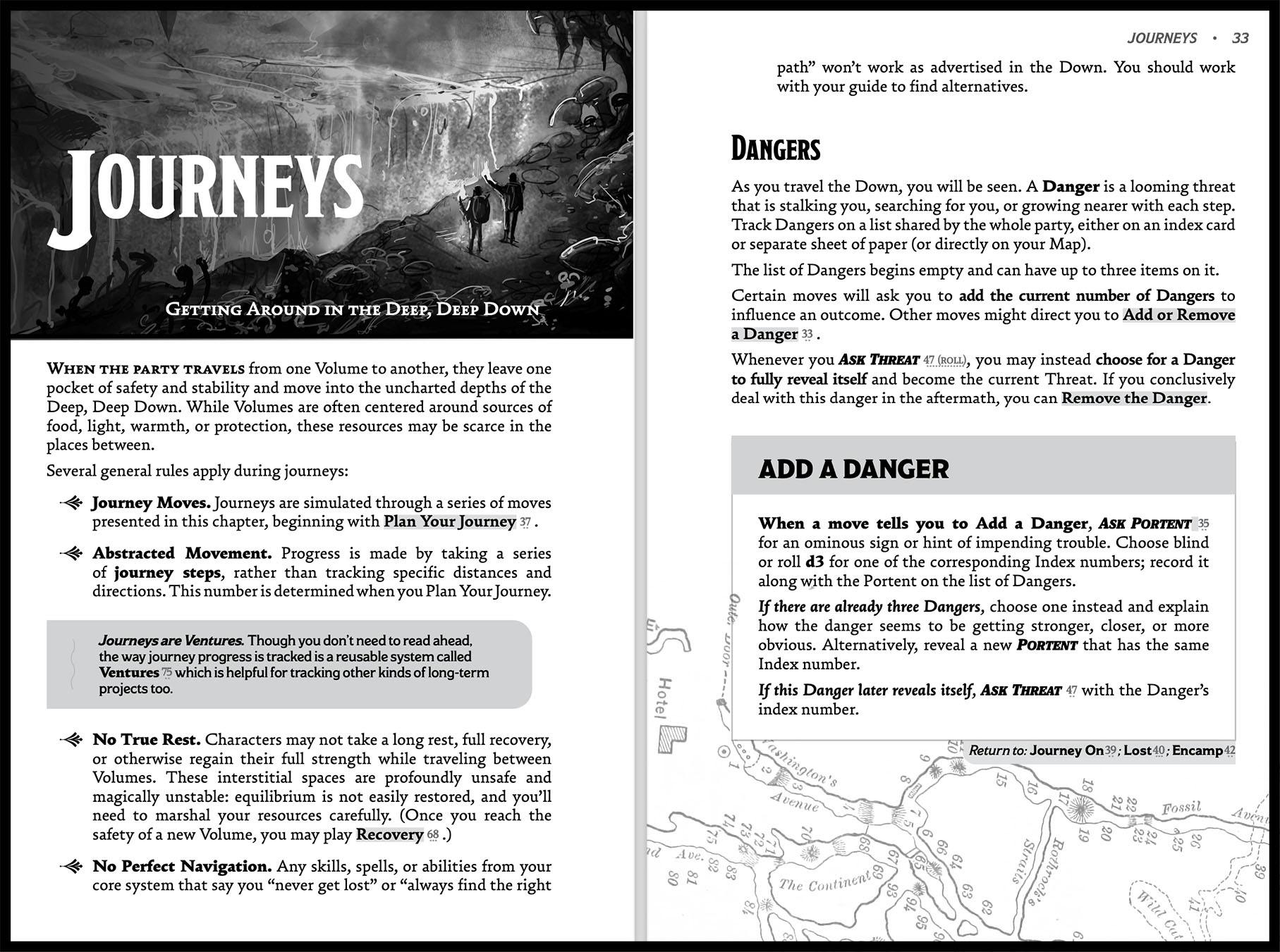The Delver's Guide, a 40-page spiral bound reference book of all the Moves and Tables in the game, easy to pass around to your players or lay flat on the table for easy consultation.