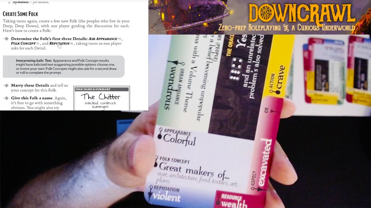I'm streaming every Thursday, meaning the next stream is tonight at 5PM PT! On stream I explain how the mechanics of Downcrawl work as we go along (most of which apply to non-solo play too), take suggestions from chat about what to do next, and generally have a fun, cozy time. I'd love to have you join us for tonight's stream! (And if you can't make it, a video replay will be posted later on.) There are also some highlight videos on the Twitch page showing specific mechanics in action (here's one where I create a new Folk for my world).