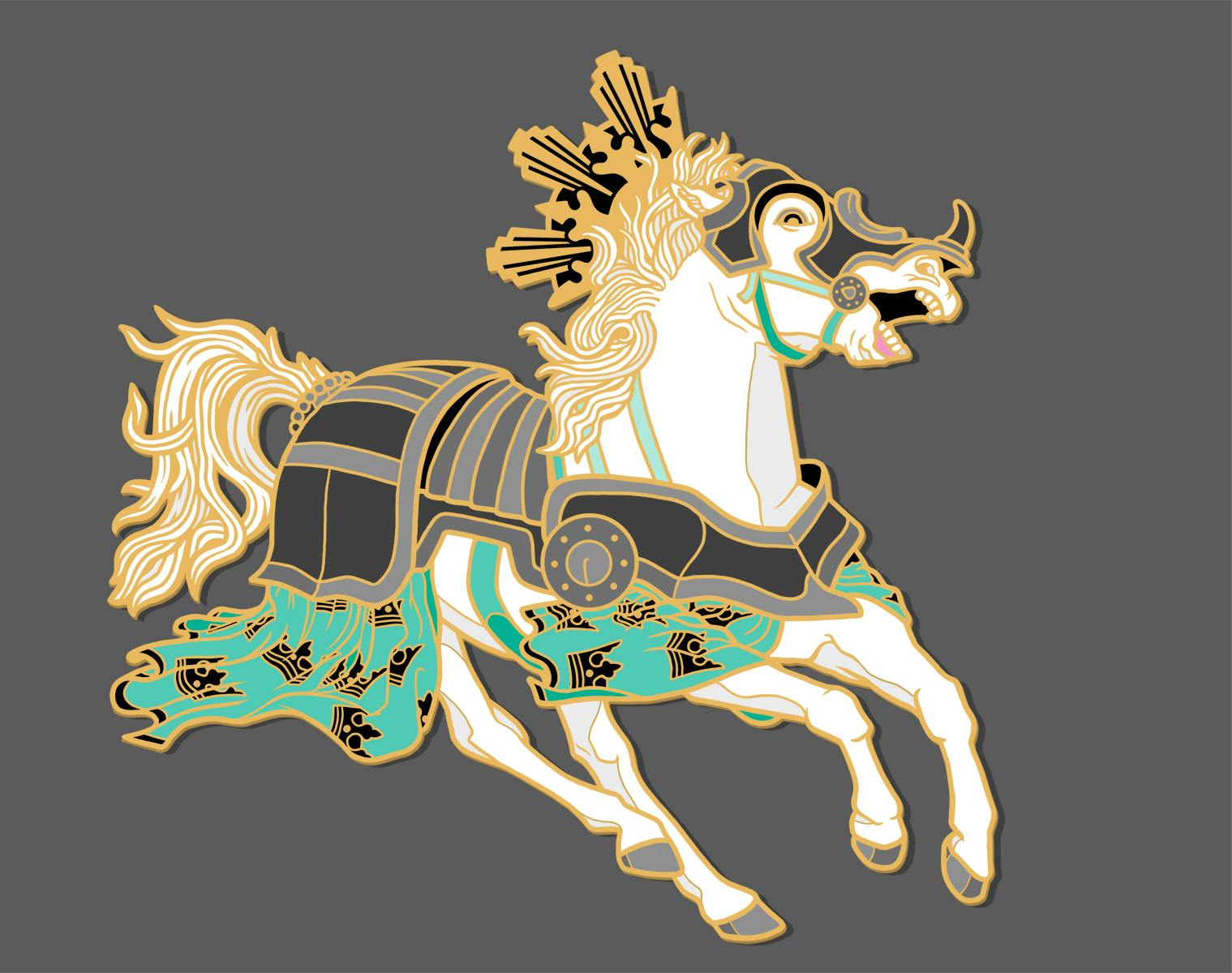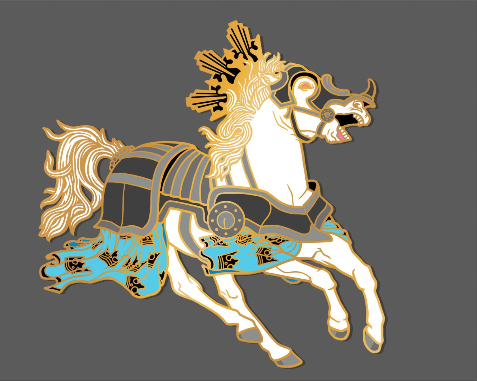 You might be wondering why I've changed the extended front leg from last weeks sketch? It was a practical decision because keeping that outstretched leg would mean I'd likely have had to make this pin 3" wide instead of my planned 2.5" in order to match the scale of the other designs. This would make it more expensive to produce than the others and I'd prefer to keep the prices of them all the same for the campaign to make it simpler for both you and me. 😅 Hopefully the Conquest pin still looks equally cool with the leg adjustment!