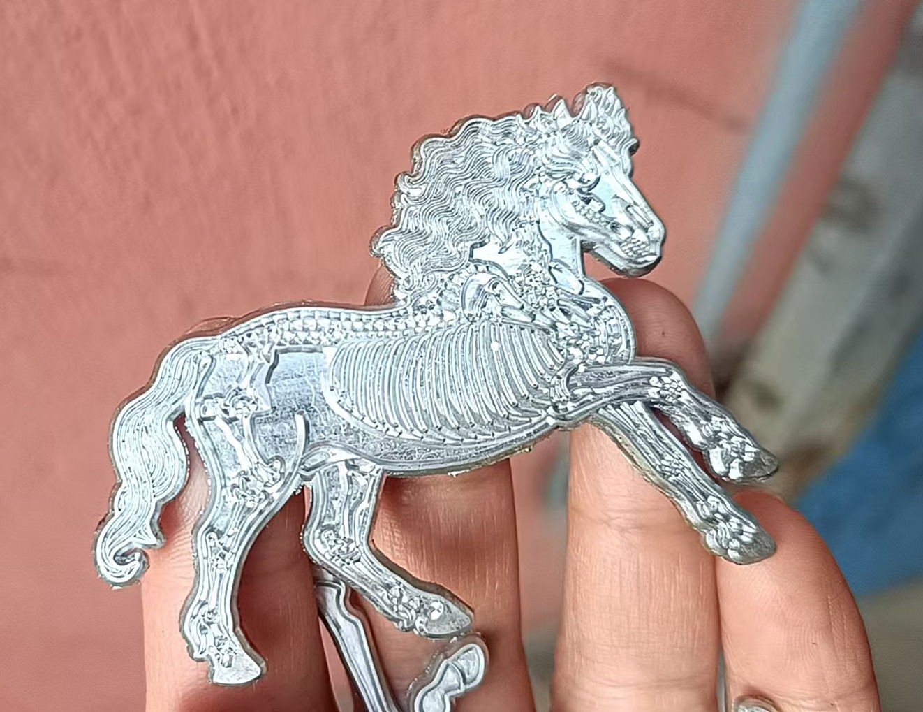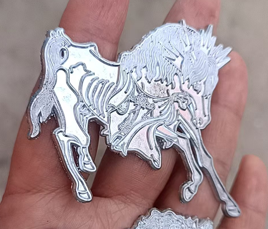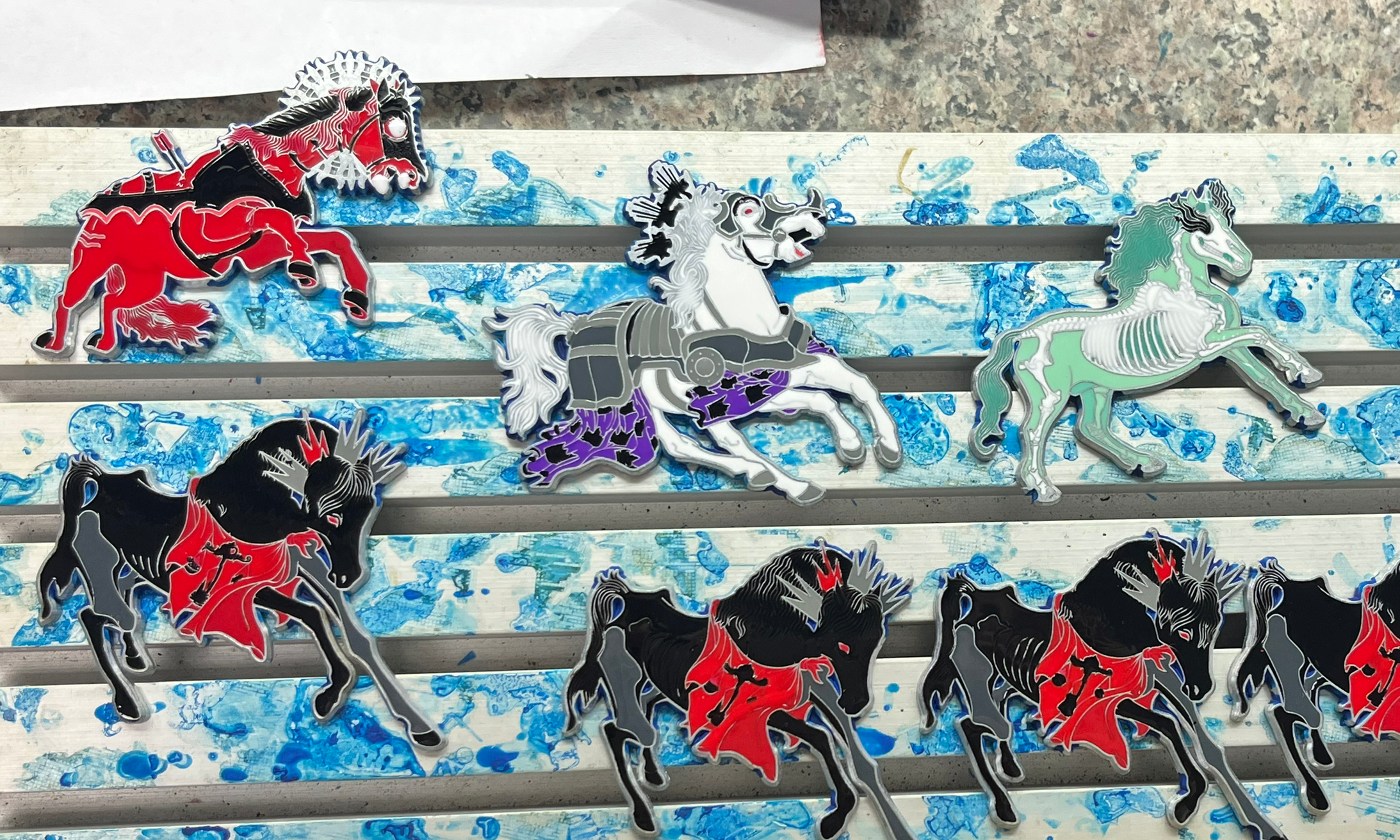 This sanding process is why I had to thin down the lines of the manes and tails from my original design. Because hard-enamel pins are sanded down the metal lines turn out a little thicker than the original mold when finished, which in the case of fine detail means you sometimes end up with lines blurring together.