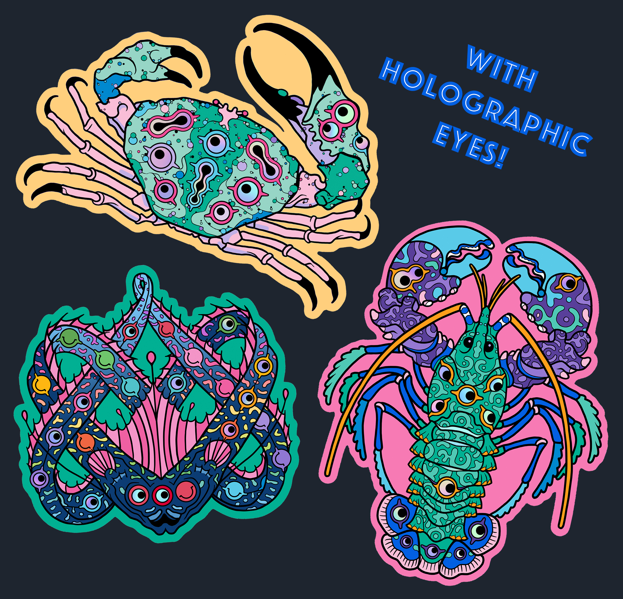 I'm checking in before the new year to share the sticker version of the Crab, Lobster and Oarfish that I finished up recently! They'll be matt vinyl with holographic eyes! :D