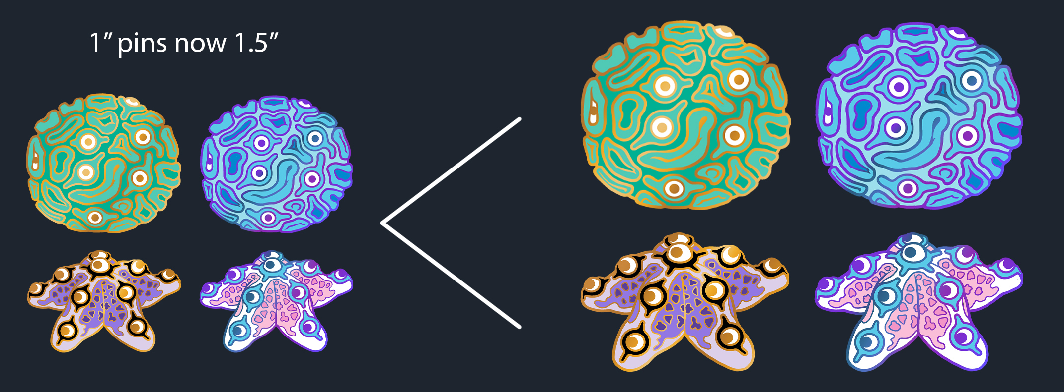 The Mini Pins: Although these were potentially doable at 1" I was concerned the tiny bits on the starfish wouldn't work out well so I decided to just increase these to 1.5" in size to avoid any further potential issues holding up the process. I hope you folks don't mind the upgrade!