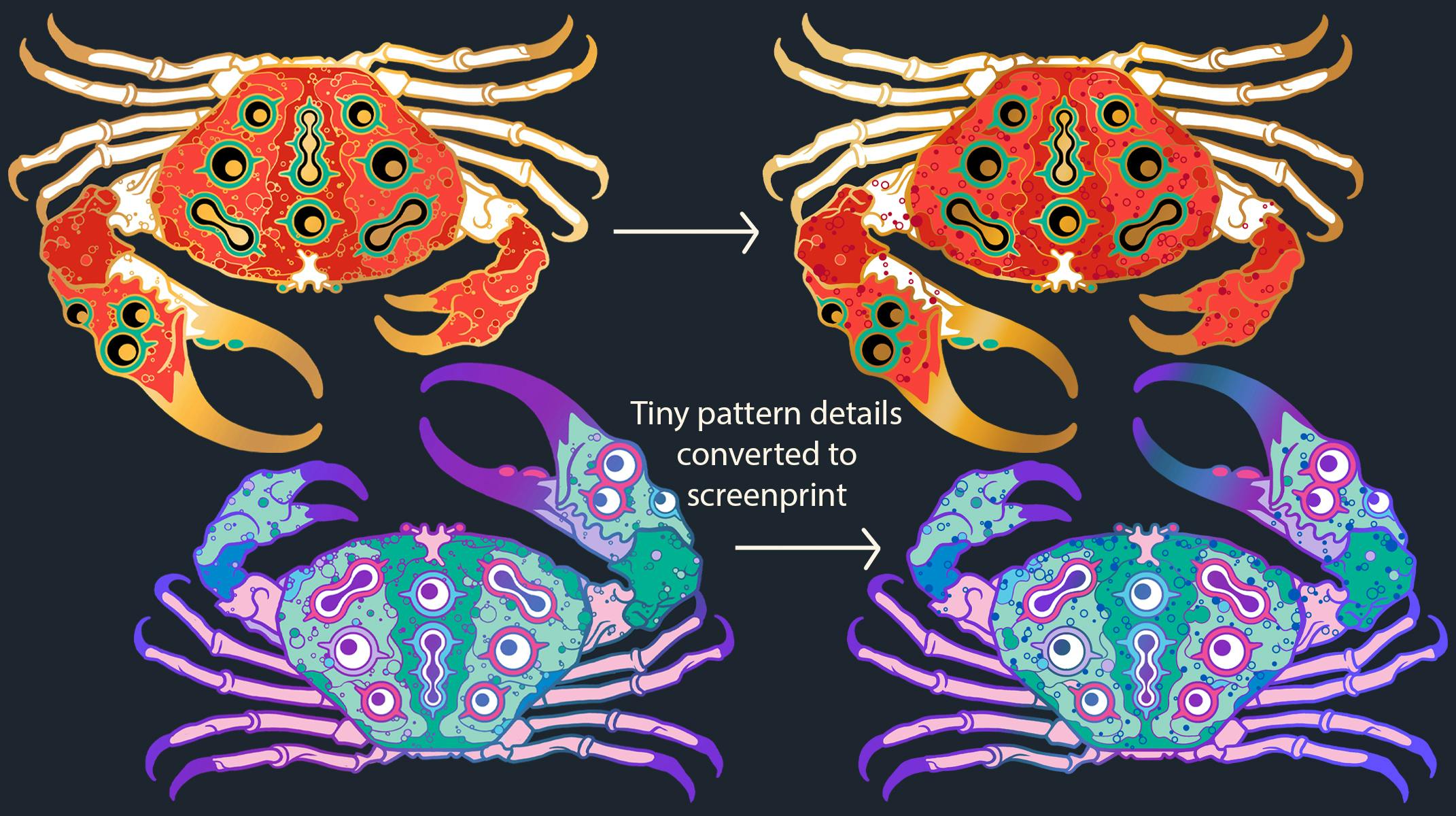 The Crab: In this case I didn't feel I could keep the essense of the design by enlarging all the circle-texture-details so I decided to replace thise parts with screenprint; in red on the gold-plated crab, and in blue on the rainbow-plated crab. I think the screenprint provides a much cleaner look and you can see from the image above that the overall appearance hasn't changed much from the original intention.