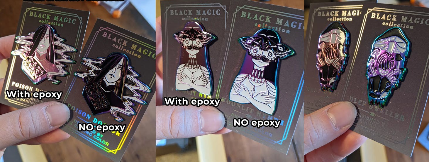 Here are some photos of some of my friend Holoraindrops pins with epoxy vs no epoxy so you can see what the difference in effect is: