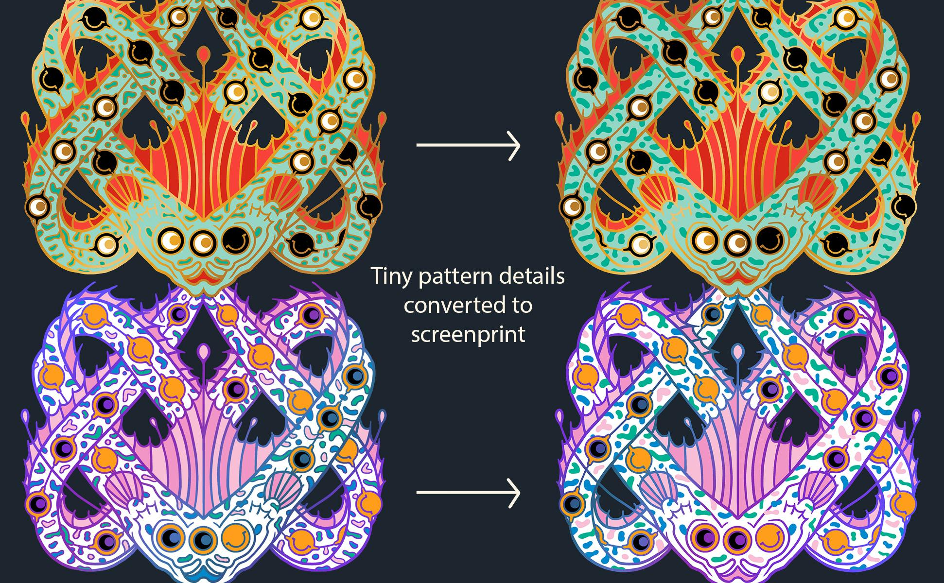 But to be extra sure these pins will look their best I decided to do some further work on the pin designs myself before ordering them from this manufacturer. These mainly come down to simplifying some pattern elements or converting parts of them to screen-print, and increasing the size of the 1" pins to 1.5".