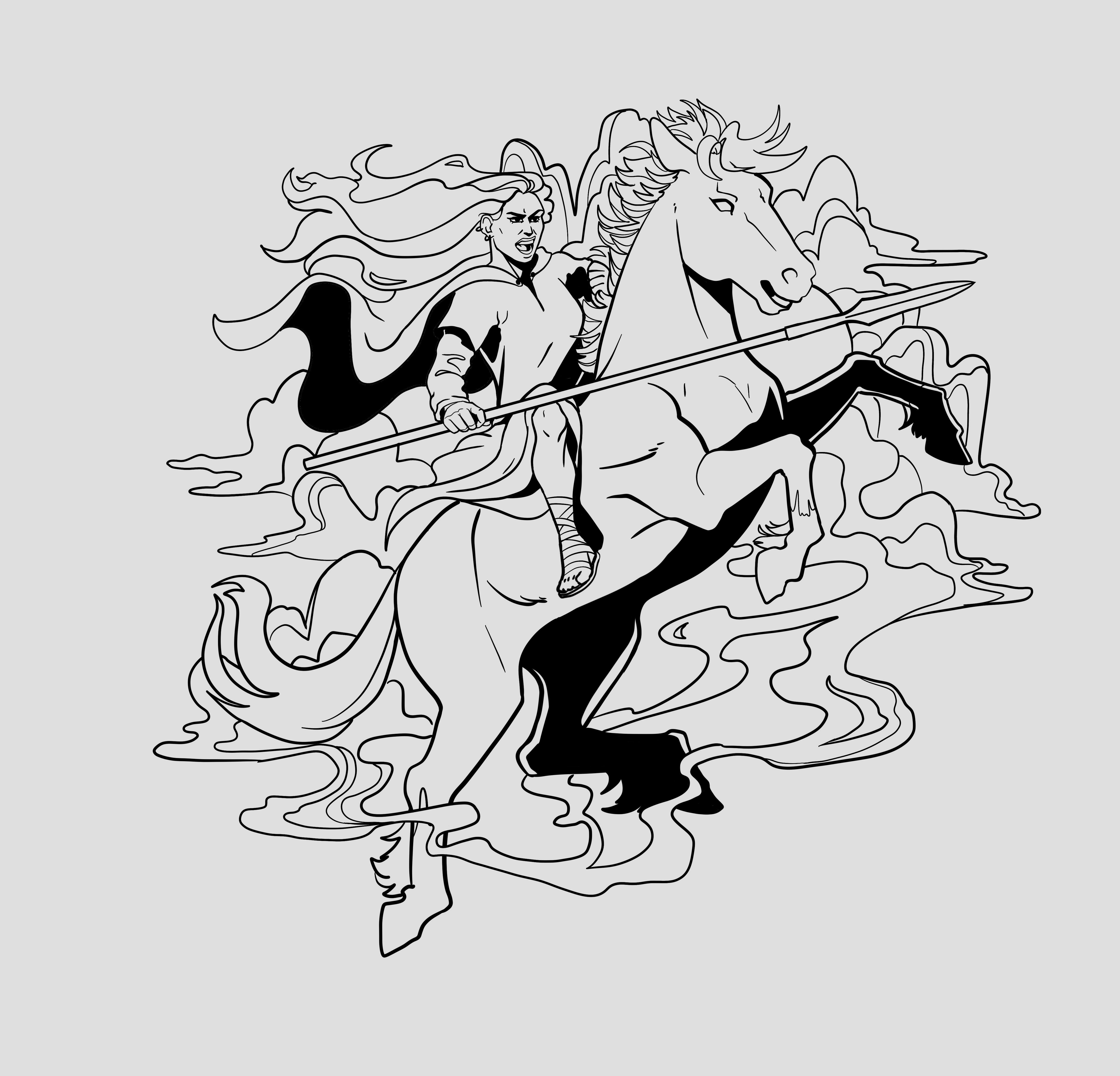 Then we have the Valkyrie. I’m really happy with mmmmmost of this, I’m not happy with her clothes. I’m not sure if i should go for more of the modern look associated with them and add wings or the metal chest piece they are usually shown with, or retry drawing her period appropriate. I usually try and stick closer to the source material but this first attempt isn’t doin it for me. The horse is a fjord horse, because from what I’ve found that would have been an option at the time. I’ll probably have to simplify a few things for this before actually making it a pin but that’s life.