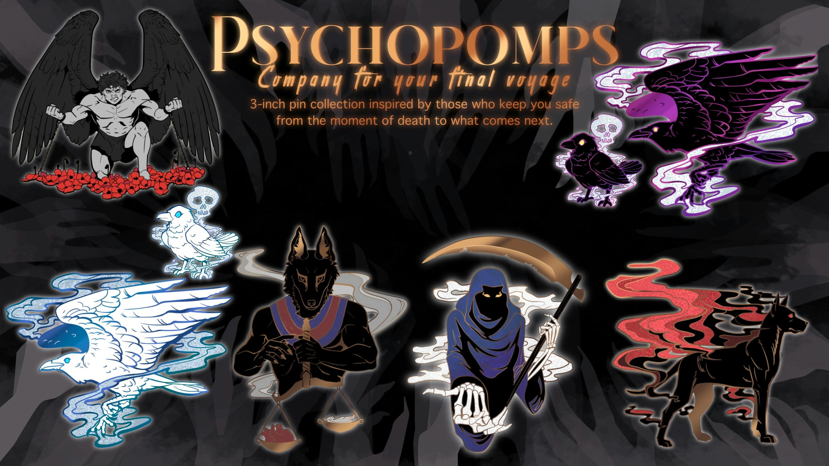 Pretty happy with the other designs I have “finalized” at the moment, working on the smaller versions of most of them. Also debating if it’s too many birds to also do a vulture. I’m hoping to add Azreal to the line up, and maybe a shinigami? They don’t have a set look so I’m trying to find a myth where they are specifically described so I can use that. If anyone has any please feel free to share :]