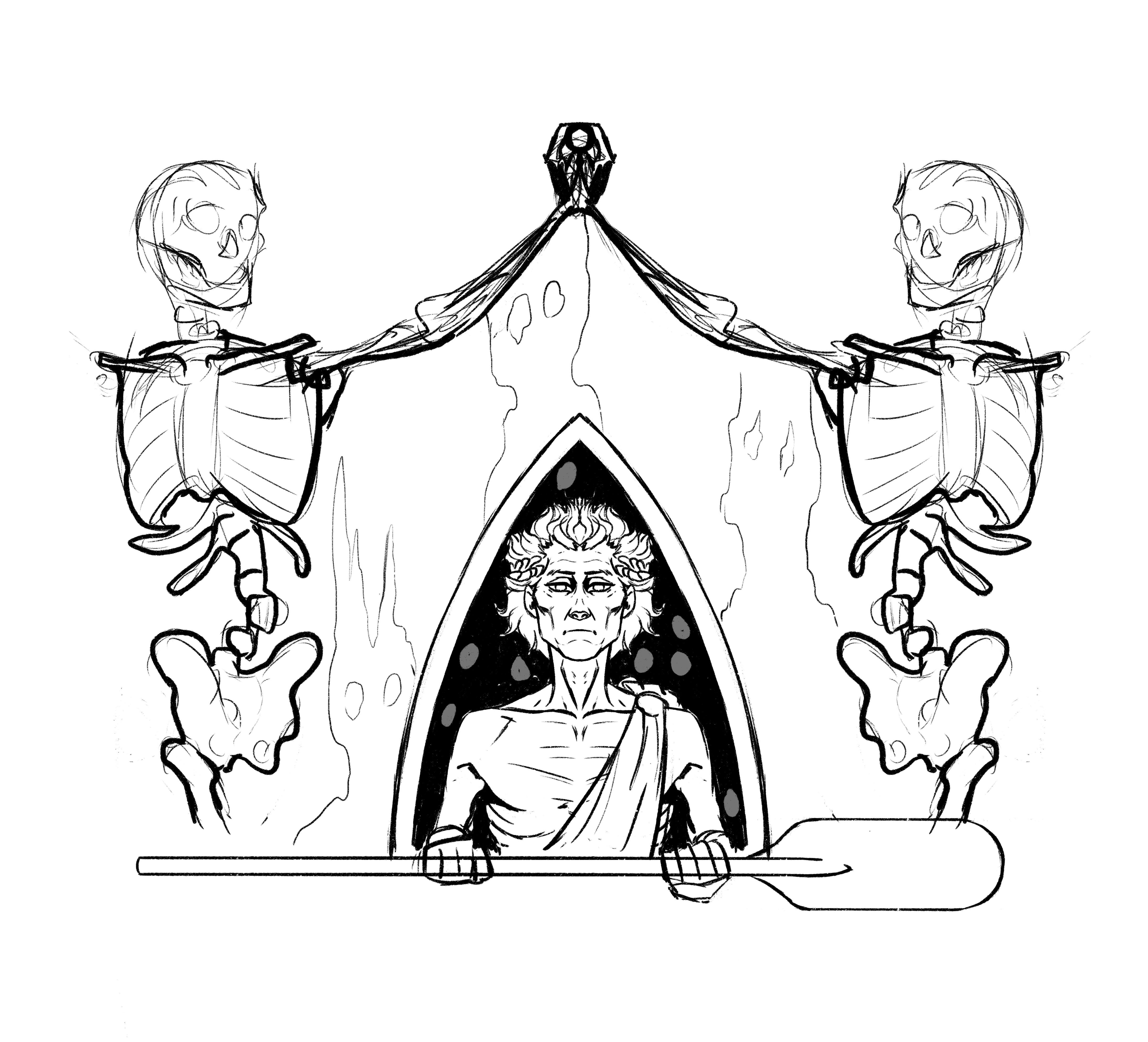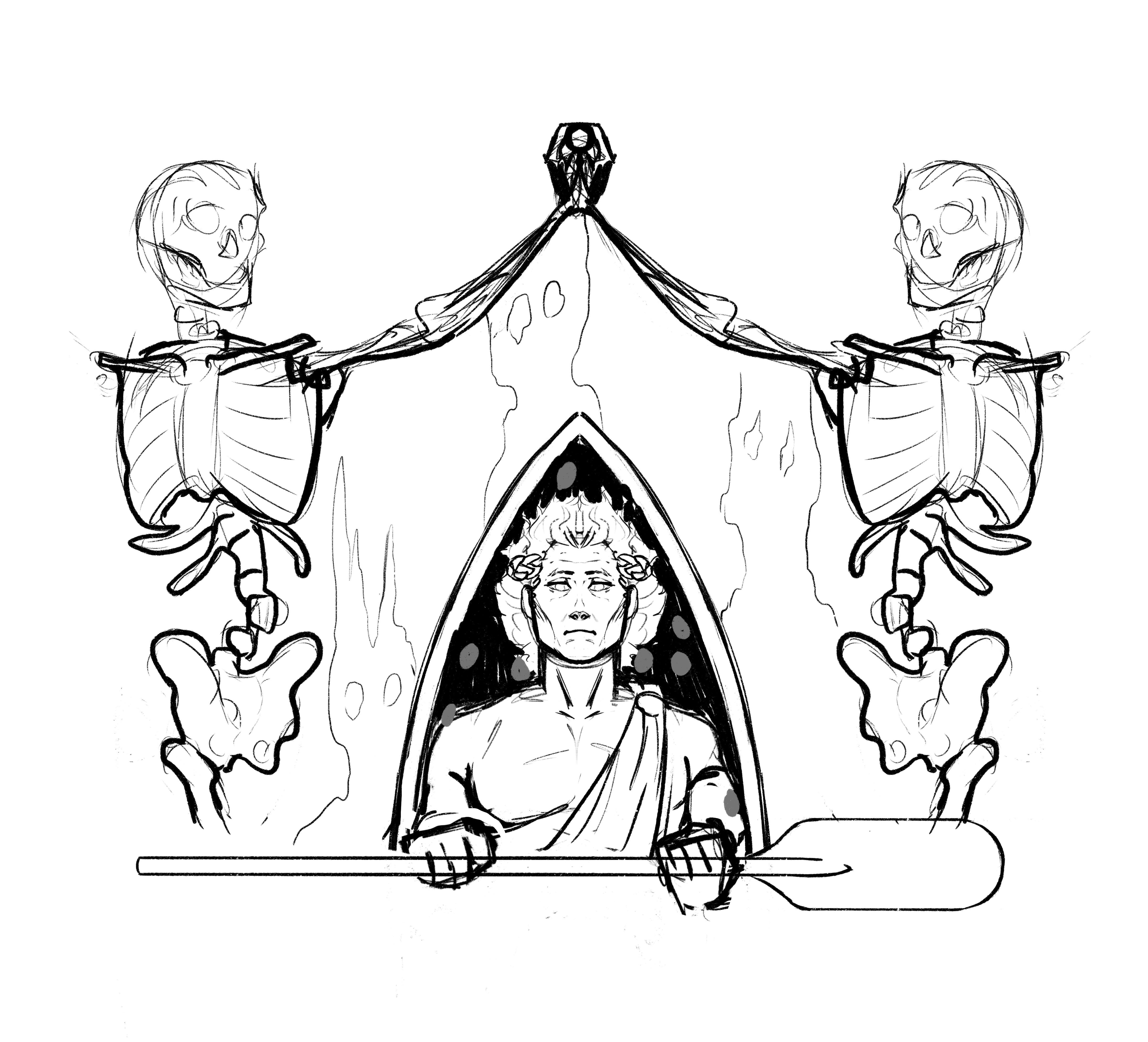 First: Charon! I’m trying to decided between the bigger, stronger looking Charon, seeing as he is rowing a boat all day every day and he is usually depicted as a bit more burly (because that’s just how Greek art be) and the more skeletal look which suits his station more I think. I’m also considering if it would be best to have the skeletons on the side symmetrical or not. I like drawing skeletons so I’m not upset either way. Behind the boat he is laying in the water will be transparent enamel with the ghostly figures being half raised so they show up underneath, hoping to give it a river styx sort of effect.