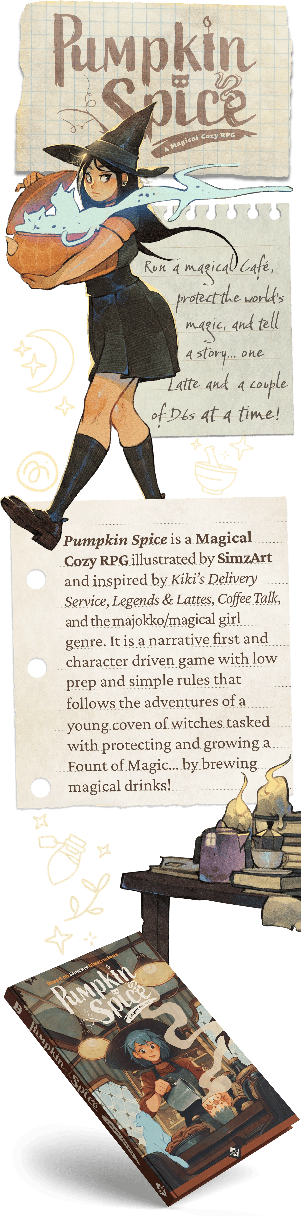 Run a magical Café, protect the world's magic, and tell a story... one Latte and a couple of D6s at a time! Pumpkin Spice is a magical, cozy RPG illustrated by SimzArt, inspired by Kiki’s Delivery Service, Legends & Lattes, Coffee Talk, and more