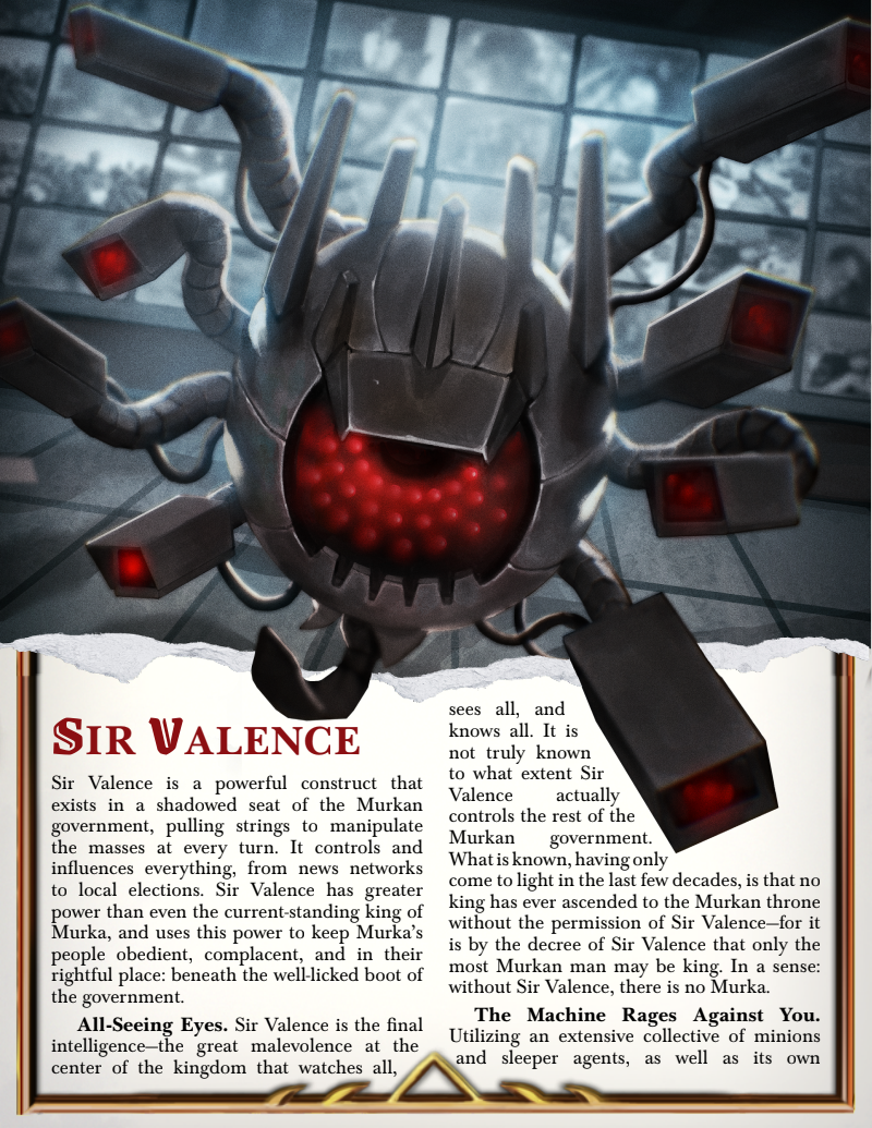 This guy was SO much fun to design. We knew we wanted to create a new BBEG that was bigger-er and badder-er, to match this edition of Murka, and Sir Valence is all that and a bag of microchips.