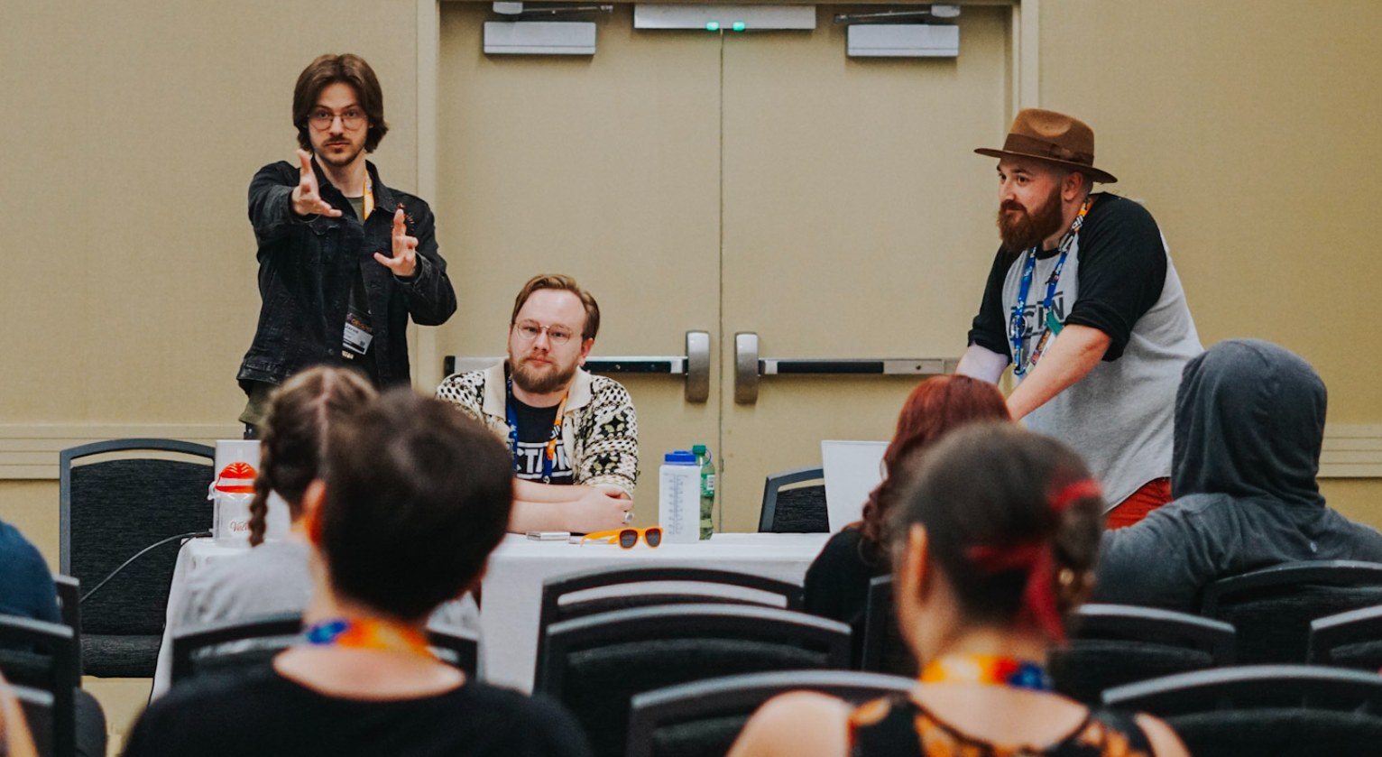 From left to right, that’s me (Jaron), my brother (CJ), and our best friend, Brad (Brad). This photo was taken at Origins Game Fair in June of this year.