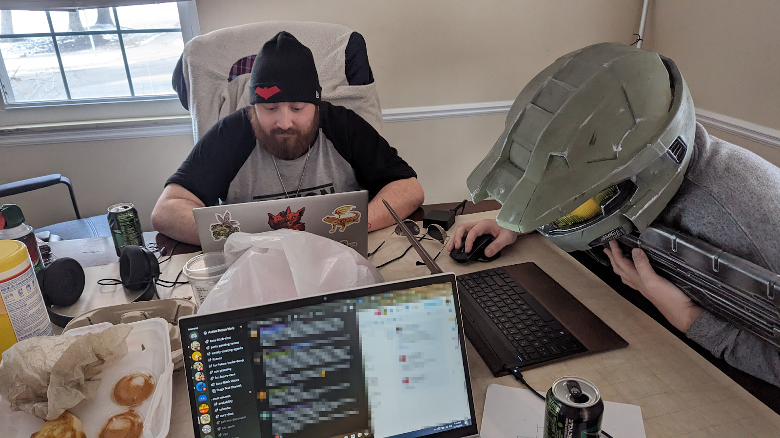 Like this very serious photo from one of our writing sessions during work on our original RPG, Cthulhu Dreamt.