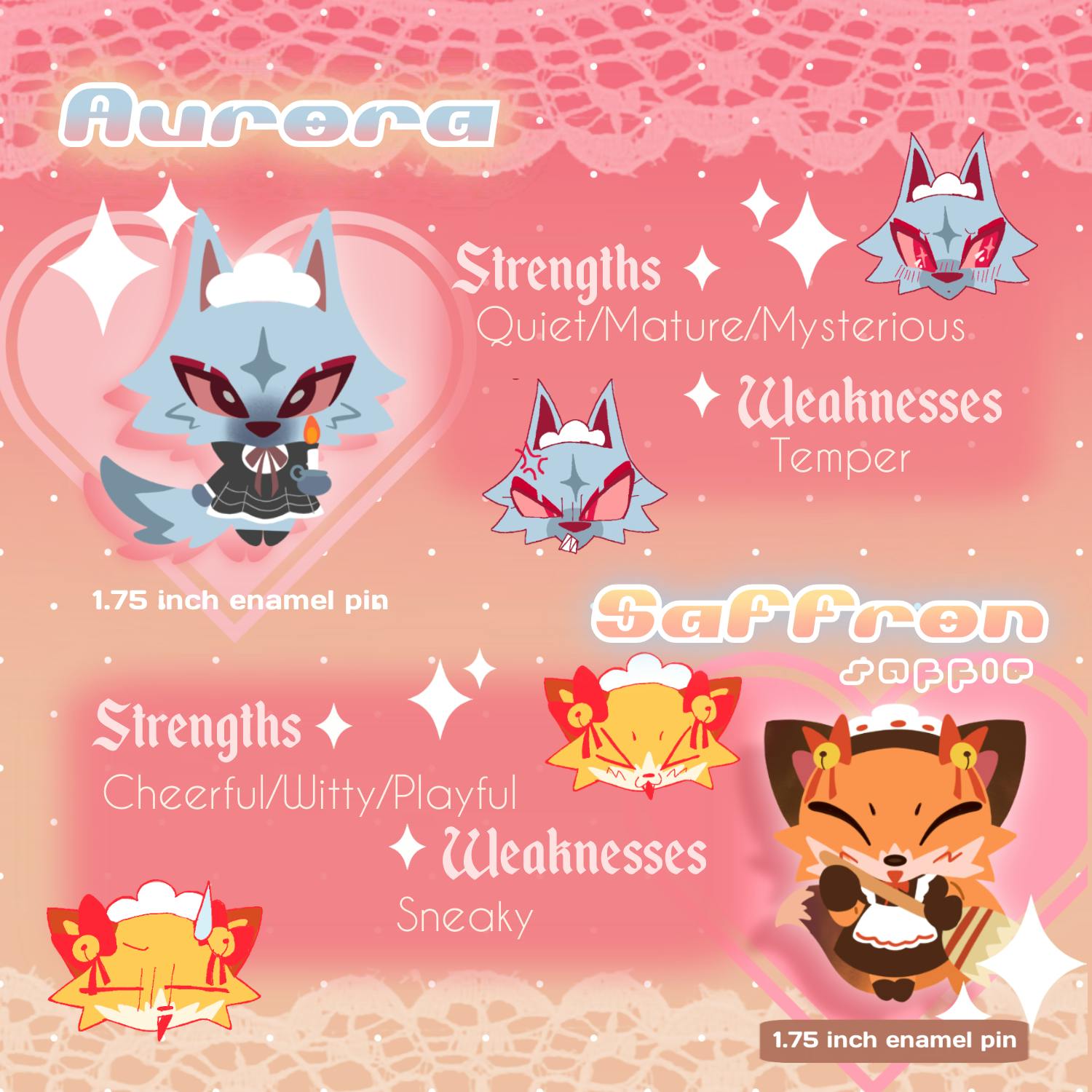 Aurora is a quiet, mature, and somewhat mysterious wolf maid with a bit of a temper. Saffron is a cheerful, witty and playful fox who tends to be a bit sneaky at times! Both girls come in 1.75" painted enamel pin form.