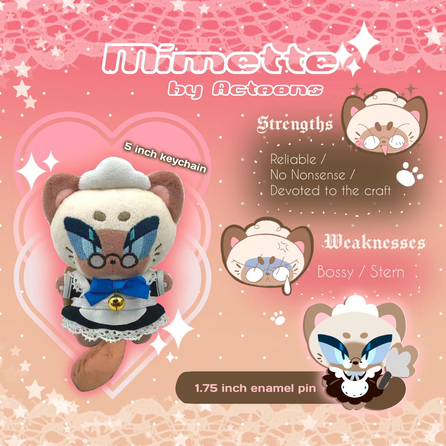 Mimette is a reliable, no nonsense cat who is devoted to her work. Her only weakness is that she can be a bit too stern at times, so the others sometimes tease her for being bossy. She comes in 5" plush keychain and 1.75" painted enamel pin forms.