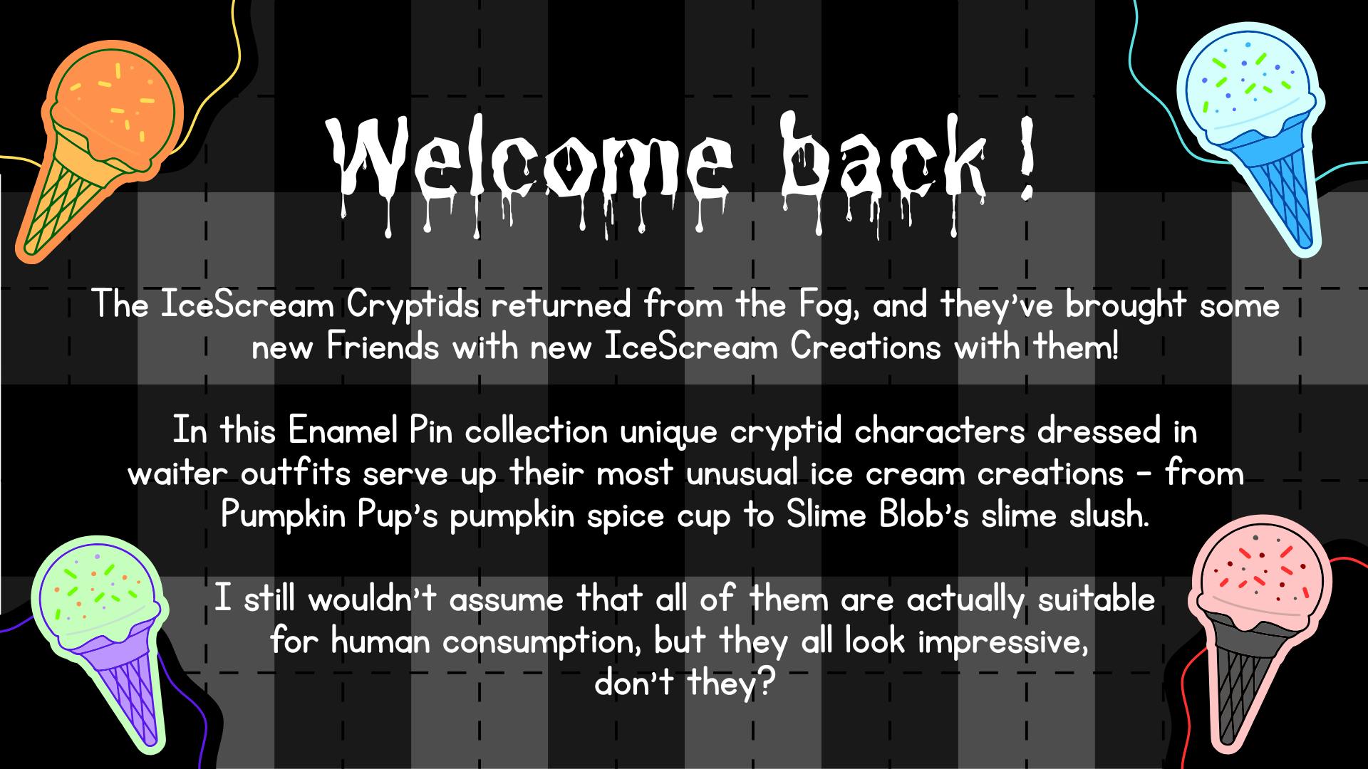The IceScream Crytids are back from the fog - and their hunger for ice-cold delicacies is far from satisfied. Meet old friends like Mothman & Jackalope and try new tasty creations like Pumpkin Pup's pumpkin spice cup to Slime Blob's slime slush.