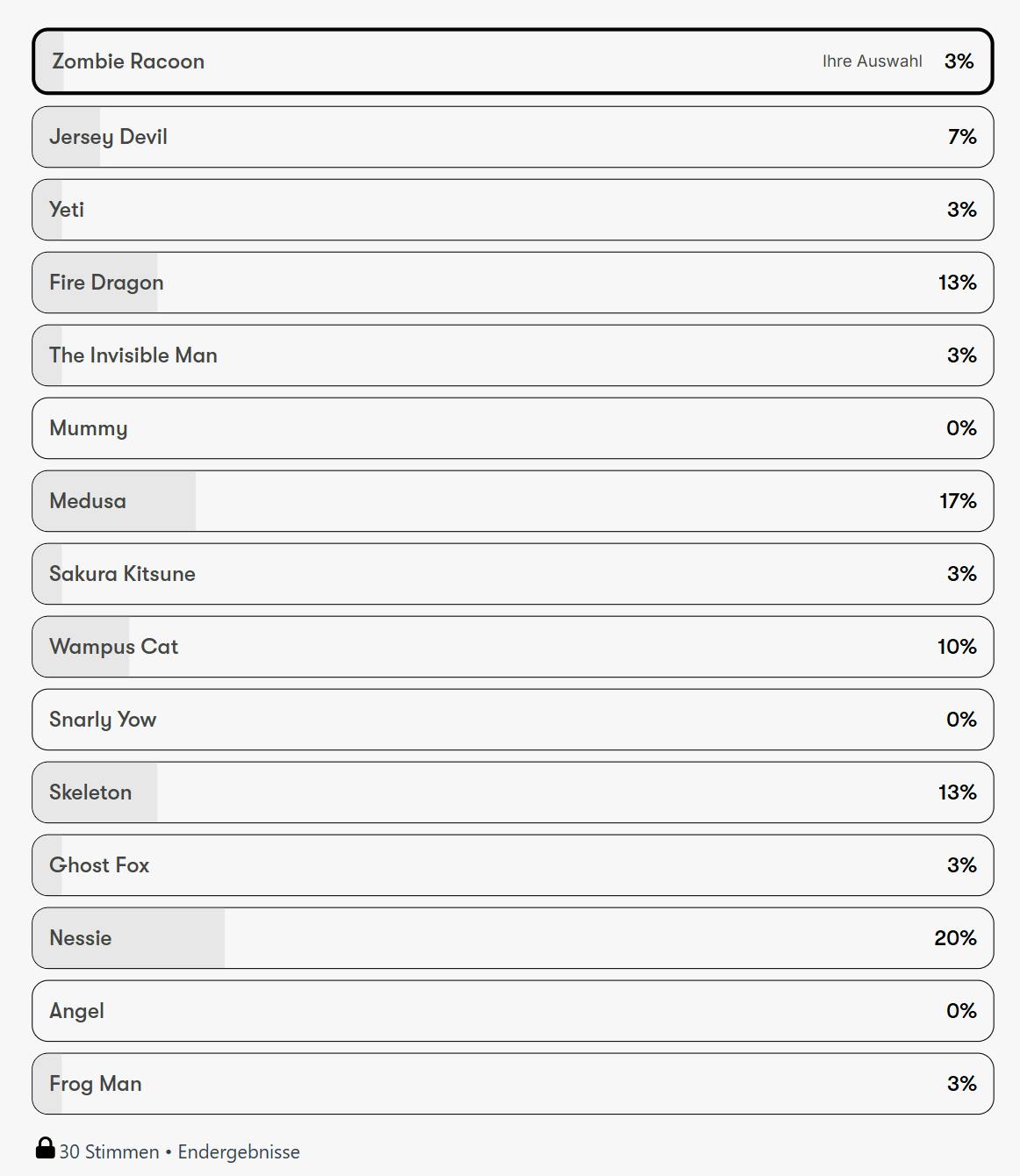 The Ones with 3-0% will get a new Poll to decide in which Order they will appear in IceScream Cryptids Part 3 (arround mid Fall - early Winter).