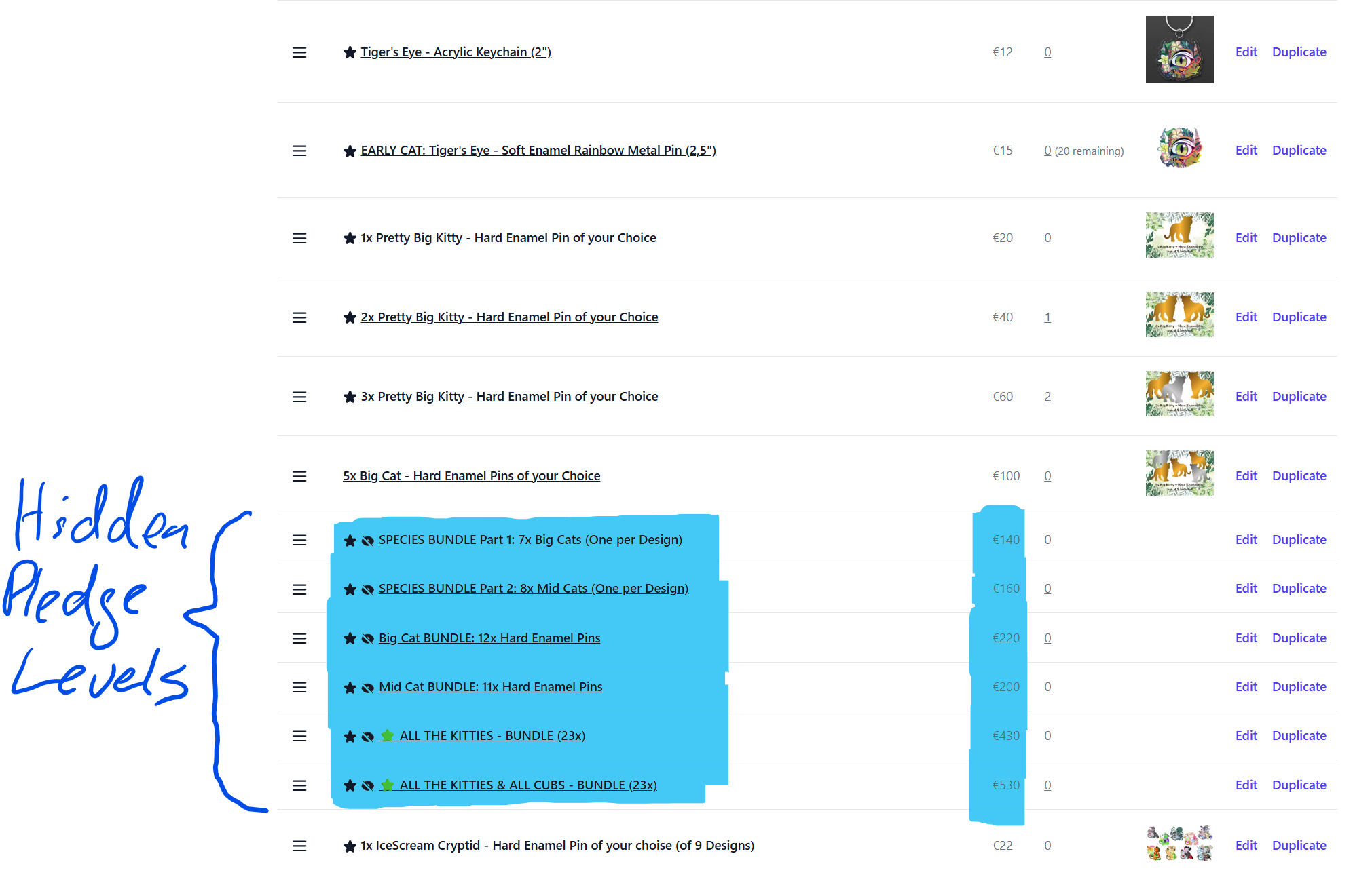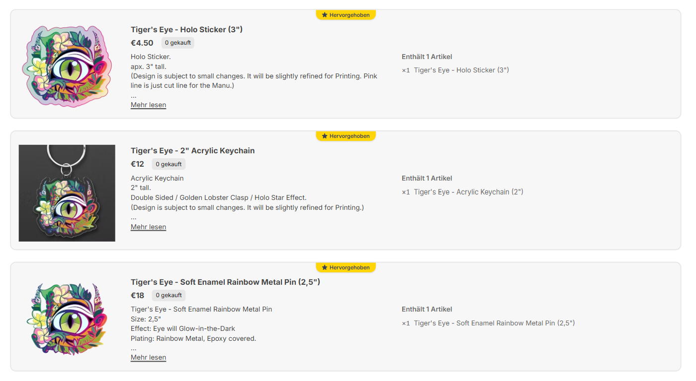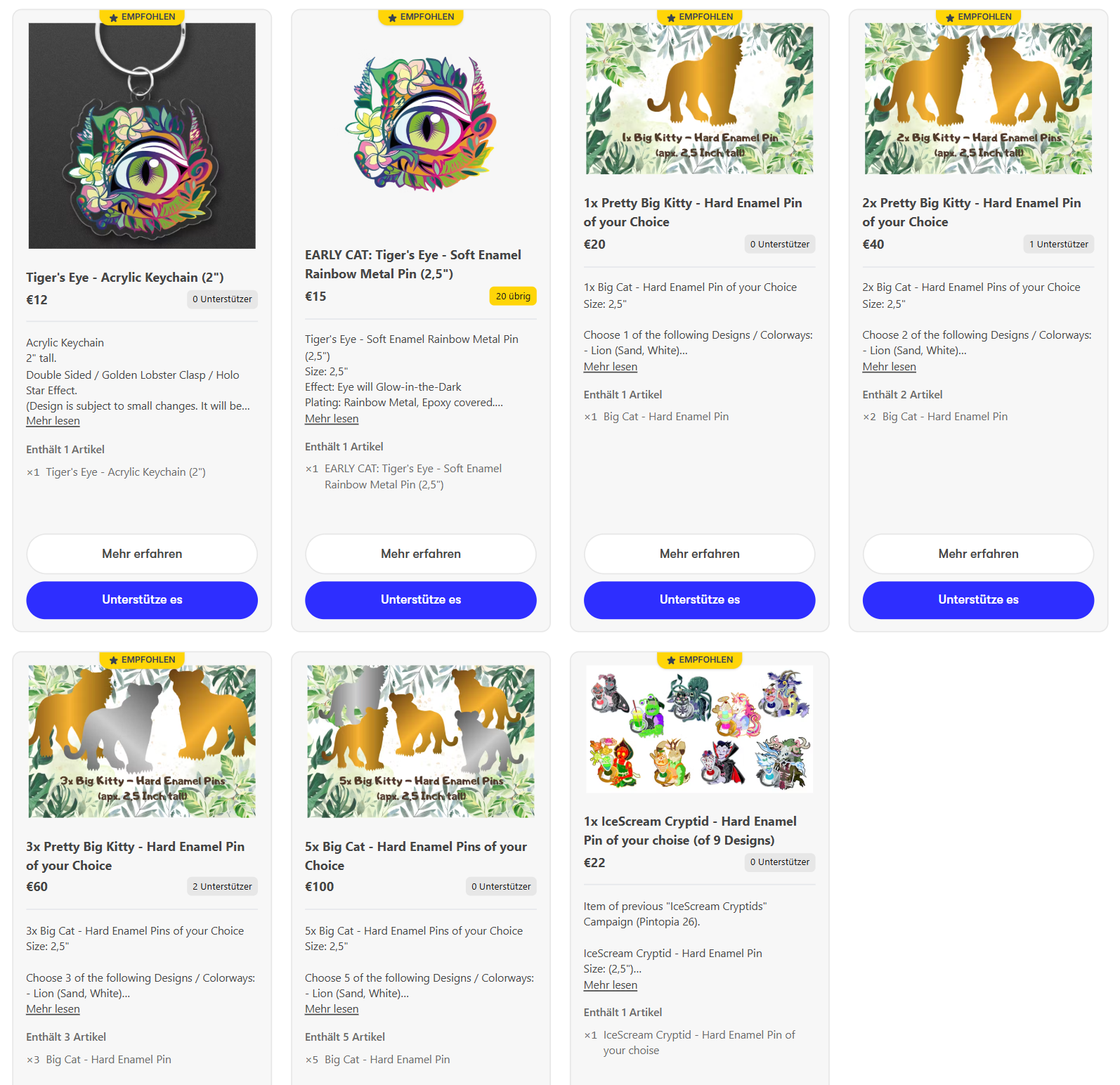 I also work with the funktion of "hidden Pledge Levels this time, to aviod single high Pledges are not able to fullfill in the End - So we start with the smaller ones. They'll apear when we reach specific Funding Amounts, to find under "Incentives", below.