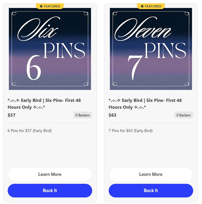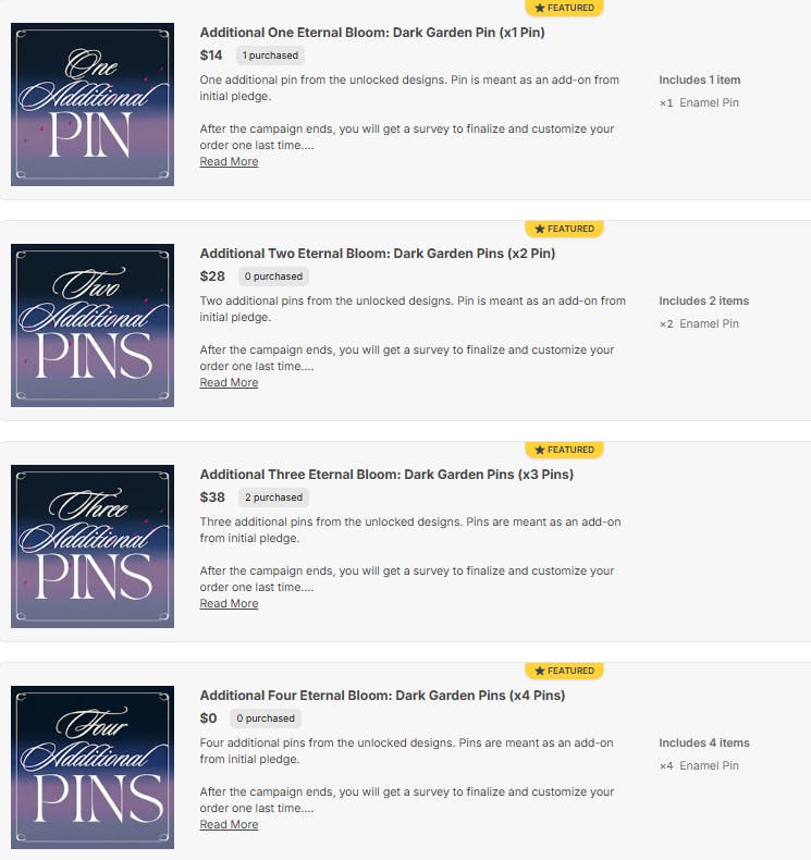 Since more designs have been unlocked, I have made add-ons for additional pins from this campaign outside of the original pledge amounts! So now if you want more than 7 pins, you can select more from the Add-On section: