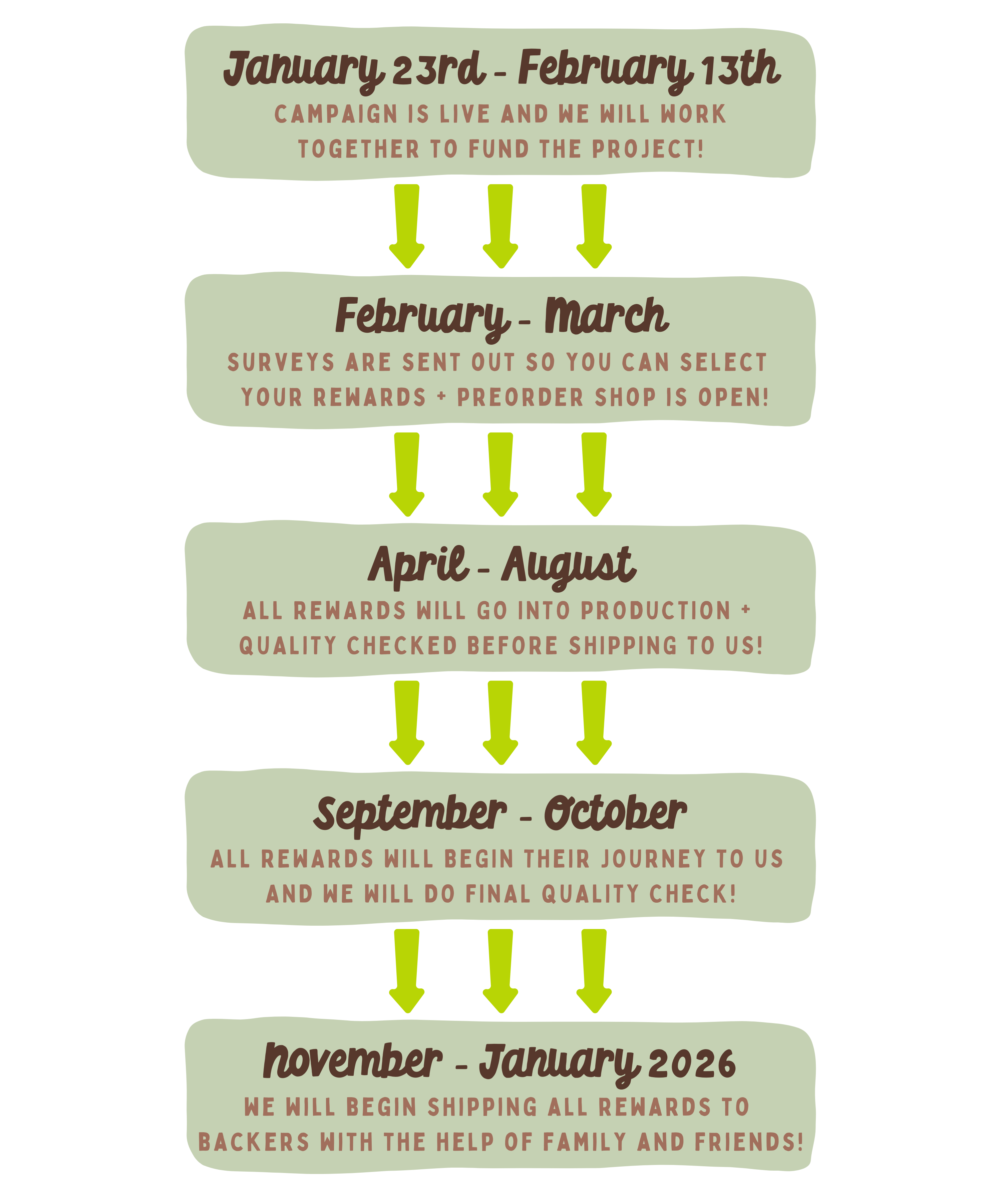 Below is the estimated timeline for Wolf Pup & Friends! We added some buffer in order to help account for any delays but in the event more delays do happen, we will be sure to keep you all updated!